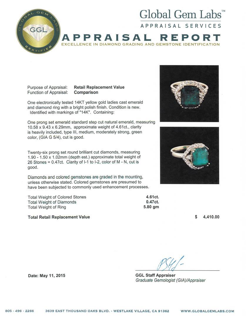 One electronically tested 14KT yellow gold ladies cast emerald and diamond ring with a bright polish finish. Identified with markings of "14K". Condition is new. Containing: One prong set emerald standard step cut natural emerald, measuring 10.58 x 9.43 x 6.29mm, approximate weight of 4.61ct., clarity is heavily included, type III, medium, moderately strong, green color, (GIA G 5/4), cut is good. Twenty-Six prong set round brilliant cut diamonds, measuring 1.90 - 1.50 x 1.02mm (depth est.) approximate total weight of 26 Stones = 0.47ct. Clarity: I-1 to I-2. Color: M - N, Cut is Good. Diamonds and colored gemstones are graded in the mounting, unless otherwise stated. Colored gemstones are presumed to have been subjected to commonly used enhancement processes. Total Weight of Colored Stones 4.61ct. Total Weight of Diamonds 0.47ct. Total Weight of Ring 5.80 grams. GGL Appraised at $4,410.00.