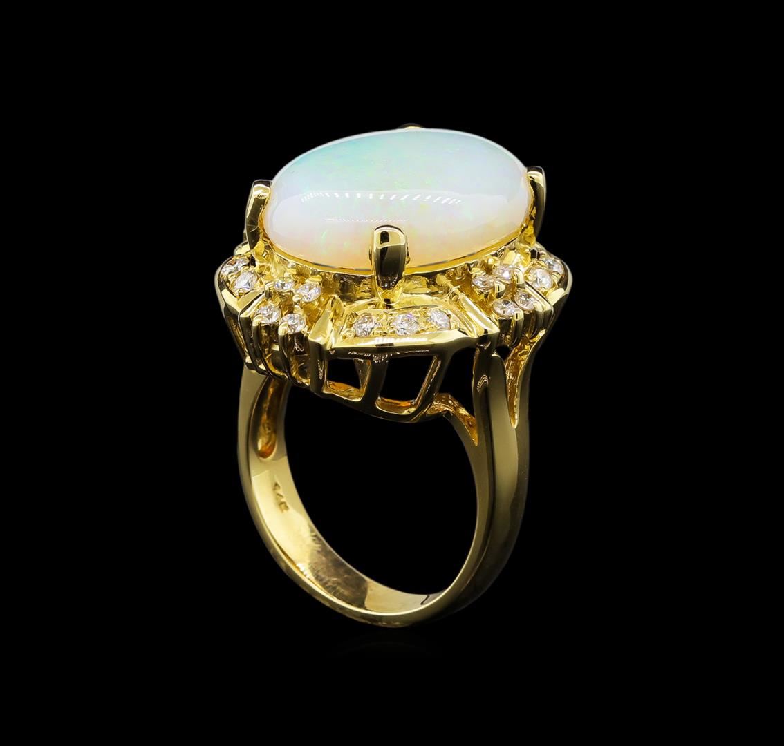One electronically tested 14KT yellow gold ladies cast opal and diamond ring with a bright polish finish. Identified with markings of "14K". Condition is new. Containing: One white opal that is cut in a oval shape and is prong set, measuring 19.00mm long x 14.00mm wide, and 4.00mm thick and the approximate weight is 4.68 carats. The opal has a somewhat bright, green-blue play of color (fire) in a flashfire pattern; a low dome; a good cut; no inclusions; consistent in its brightness and pattern; and is somewhat directional. Twenty-Eight prong set round brilliant cut diamonds, measuring 1.50 - 1.50 x 0.90mm (depth est.) approximate total weight of 28 Stones = 0.51ct. Clarity: SI-1 to I-1. Color: J - K, Cut is Good. Colored gemstones are presumed to have been subjected to commonly used enhancement processes. All diamonds and colored gemstones are graded in the mounting, unless otherwise stated. Total Weight of Diamonds 0.51ct. Total Weight of Opals 4.68ct. Total Weight of Ring 10.70 grams.