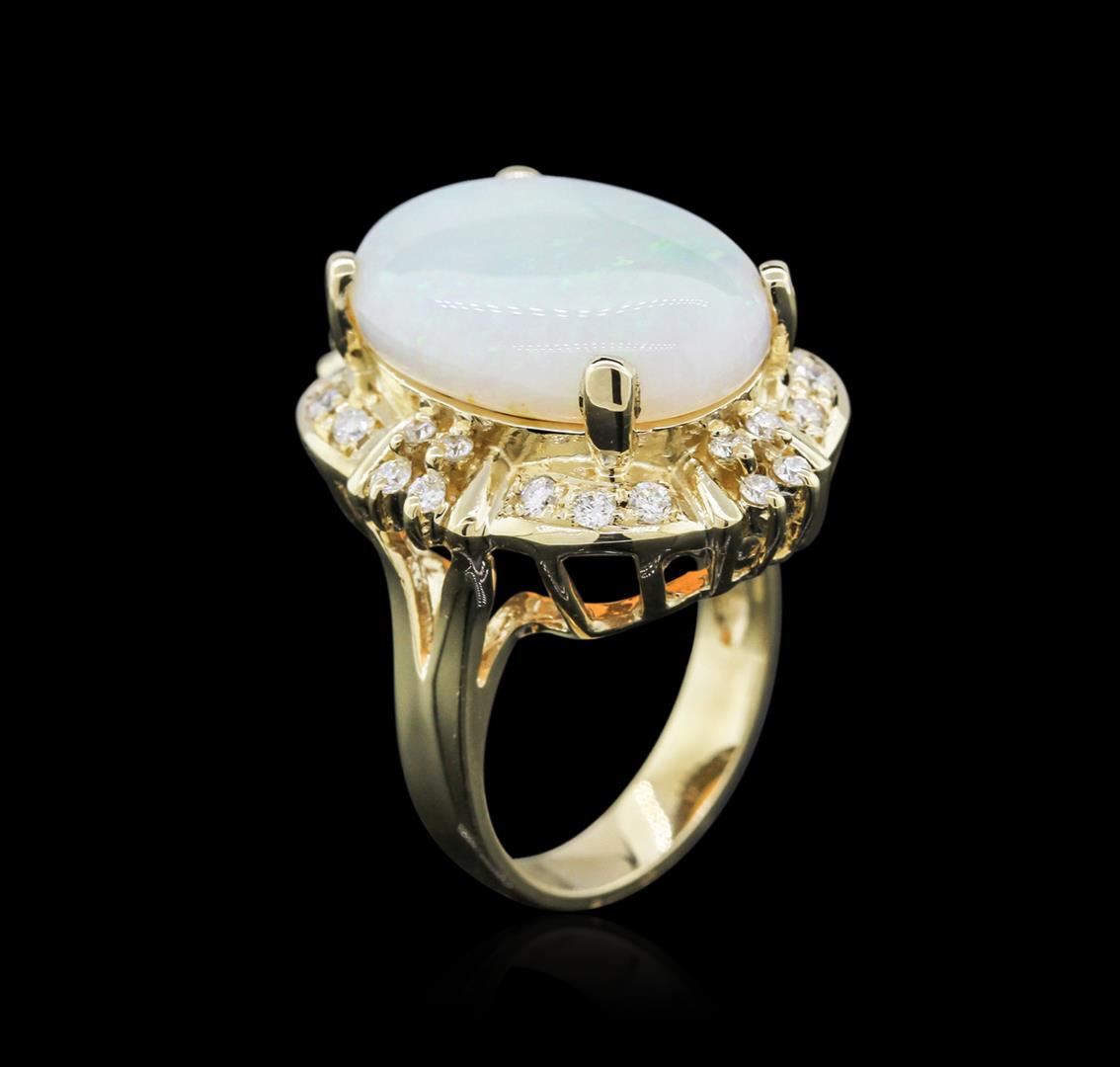One electronically tested 14KT yellow gold ladies cast opal and diamond ring with a bright polish finish. Identified with markings of "14K". Condition is new. Containing: One white opal that is cut in a oval shape and is prong set, measuring 19.00mm long x 14.00mm wide, and 4.00mm thick and the approximate weight is 4.68 carats. The opal has a somewhat bright, green-blue play of color (fire) in a flashfire pattern; a low dome; a good cut; no inclusions; consistent in its brightness and pattern; and is somewhat directional. Twenty-Eight prong set round brilliant cut diamonds, measuring 1.50 - 1.50 x 0.90mm (depth est.) approximate total weight of 28 Stones = 0.51ct. Clarity: SI-1 to I-1. Color: J - K, Cut is Good. Colored gemstones are presumed to have been subjected to commonly used enhancement processes. All diamonds and colored gemstones are graded in the mounting, unless otherwise stated. Total Weight of Diamonds 0.51ct. Total Weight of Opals 4.68ct. Total Weight of Ring 10.70 grams. GGL Appraised at $3,430.00.