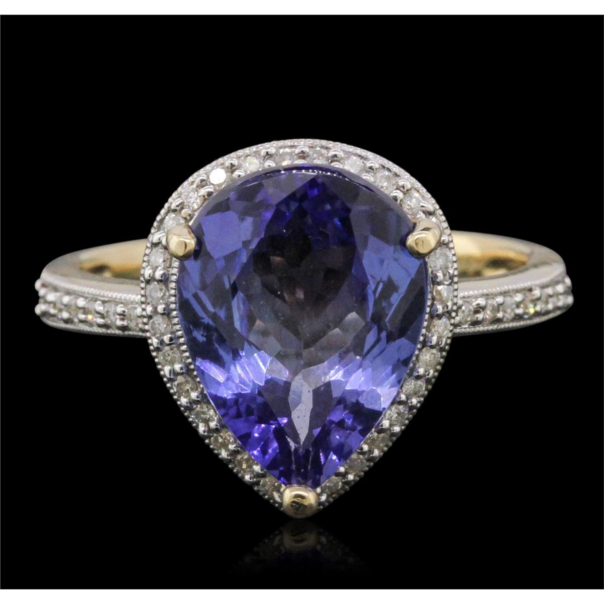 One electronically tested 14KT yellow gold ladies combination cast & assembled tanzanite and diamond ring with a flat shank with a bright polish finish. Identified with markings of "14K". Condition is new. Containing: One prong set pear modified brilliant cut natural tanzanite, measuring 12.00 x 9.51 x 6.18mm, approximate weight of 4.73ct., clarity is eye clean, type I, medium, very slightly grayish, violet color, (GIA V 5/3), cut is good. Forty-Three prong set round brilliant cut diamonds, measuring 1.00 - 1.00 x 0.60mm (depth est.) approximate total weight of 43 Stones = 0.16ct. Clarity: I-1 to I-2. Color: I - J, Cut is Good. Colored gemstones are presumed to have been subjected to commonly used enhancement processes. All diamonds and colored gemstones are graded in the mounting, unless otherwise stated. Total Weight of Colored Stones 4.73ct. Total Weight of Diamonds 0.16ct. Total Weight of Ring 4.10 grams. GGL Appraised at $8,145.00.