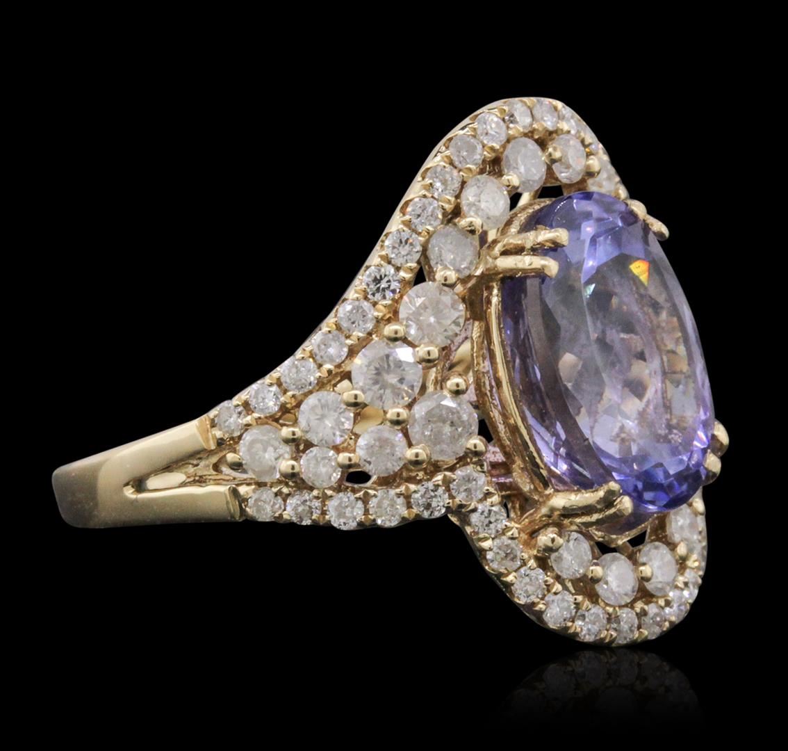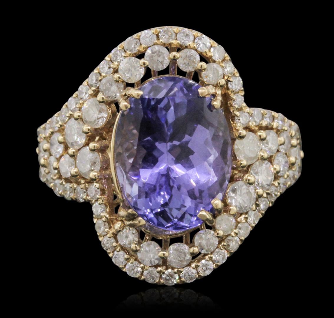 One electronically tested 14KT yellow gold ladies combination cast & assembled tanzanite and diamond ring with a flat shank with a bright polish finish. Identified with markings of "14K". Condition is new. Containing: One prong set oval modified brilliant cut natural tanzanite, measuring 11.31 x 8.60 x 7.13mm, approximate weight of 4.73ct., clarity is eye clean, type I, medium light, very slightly grayish, violet color, (GIA V 4/3), cut is good. Seventy-Two prong set round brilliant cut diamonds, measuring 2.10 - 1.30 x 1.02mm (depth est.) approximate total weight of 72 Stones = 1.29ct. Clarity: SI-1 to I-1. Color: I - J, Cut is Good. Colored gemstones are presumed to have been subjected to commonly used enhancement processes. All diamonds and colored gemstones are graded in the mounting, unless otherwise stated. Total Weight of Colored Stones 4.73ct. Total Weight of Diamonds 1.29ct. Total Weight of Ring 5.30 grams. GGL Appraised at $10,960.00.