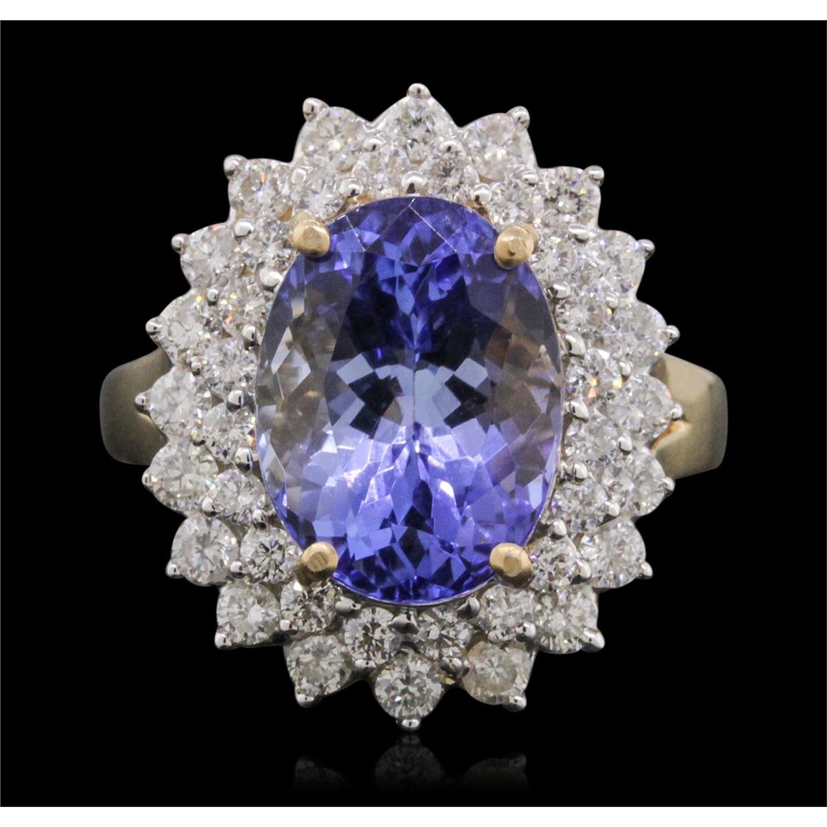 One electronically tested 14KT yellow gold ladies combination cast & assembled tanzanite and diamond ring with a split shank with a bright polish finish. Identified with markings of "14K". Condition is new. Containing: One prong set oval modified brilliant cut natural tanzanite, measuring 11.19 x 9.03 x 7.00mm, approximate weight of 4.79ct., clarity is eye clean, type I, medium, moderately strong, violet color, (GIA V 5/4), cut is good. Forty prong set round brilliant cut diamonds, measuring 1.80 - 1.50 x 0.99mm (depth est.) approximate total weight of 40 Stones = 0.66ct. Clarity: I-1 to I-2. Color: I - J, Cut is Good. Colored gemstones are presumed to have been subjected to commonly used enhancement processes. All diamonds and colored gemstones are graded in the mounting, unless otherwise stated. Total Weight of Colored Stones 4.79ct. Total Weight of Diamonds 0.66ct. Total Weight of Ring 6.60 grams. GGL Appraised at $9,785.00.