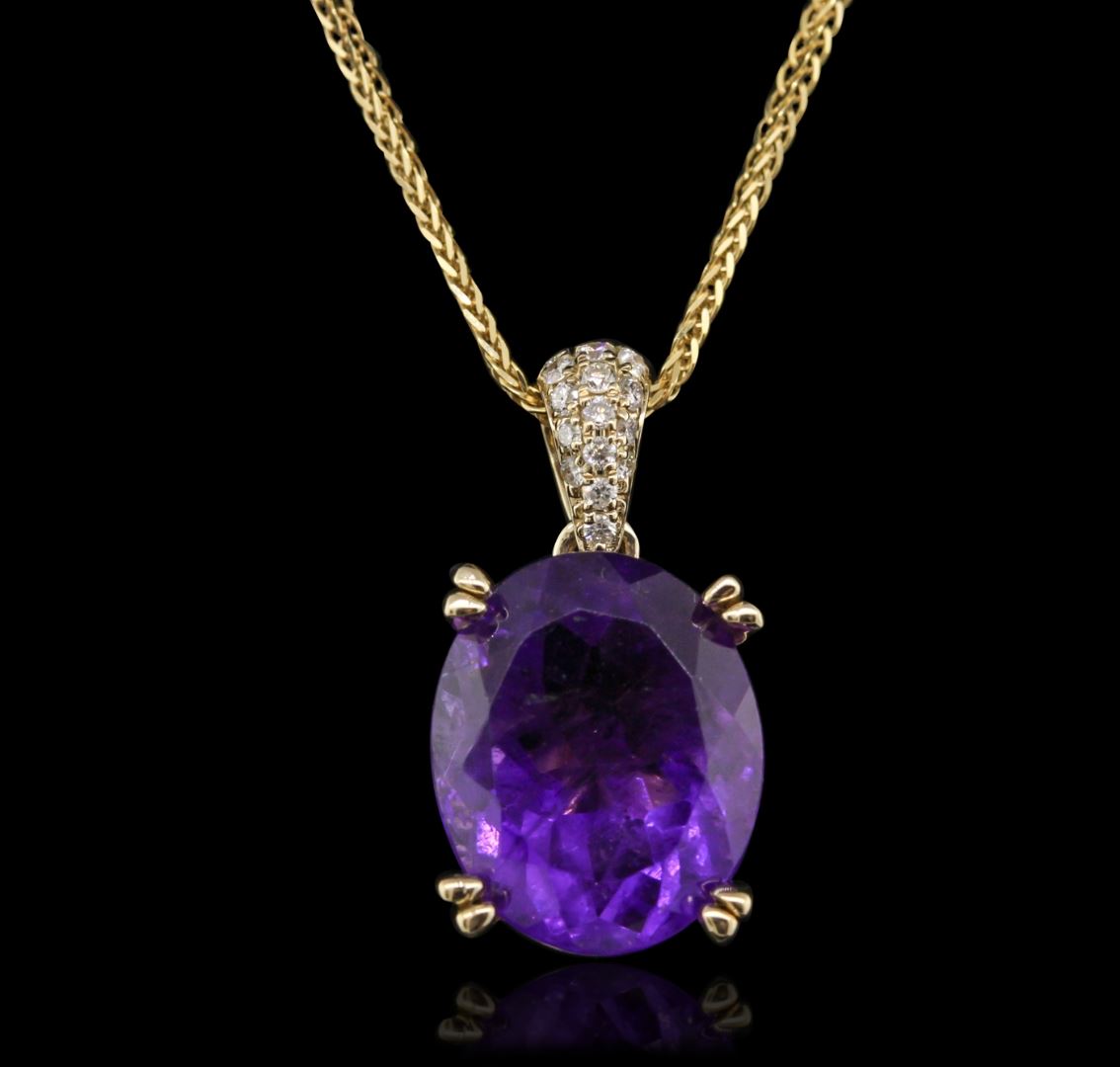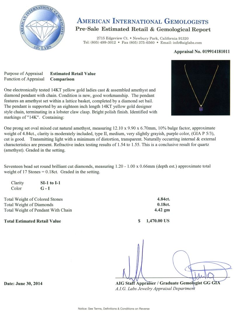 One electronically tested 14KT yellow gold ladies cast & assembled amethyst and diamond pendant with chain. Condition is new, good workmanship. The pendant features an amethyst set within a lattice basket, completed by a diamond set bail. The pendant is supported by an eighteen inch length 14KT yellow gold designer style chain, terminating in a lobster claw clasp. Bright polish finish. Identified with markings of "14K". Containing: One prong set oval mixed cut natural amethyst, measuring 12.10 x 9.90 x 6.70mm, 10%. bulge factor, approximate weight of 4.84ct., clarity is moderately included, type II, medium, very slightly grayish, purple color, (GIA P 5/3), cut is good. Transmitting light with a minimum of distortion, transparent. Naturally occurring internal & external characteristics are present. Refractive index testing results of 1.54 to 1.55. This is a conclusive result for quartz (amethyst). Graded in the setting. Seventeen bead set round brilliant cut diamonds, measuring 1.20 - 1.00 x 0.66mm (depth est.) approximate. Total Weight of 17 Stones = 0.18ct. Graded in the setting. Clarity: SI-1 to I-1. Color: G - I. Total Weight of Colored Stones 4.84ct. Total Weight of Diamonds 0.18ct. Total Weight of Pendant With Chain 4.42 grams. AIG Appraised at $1,470.00.