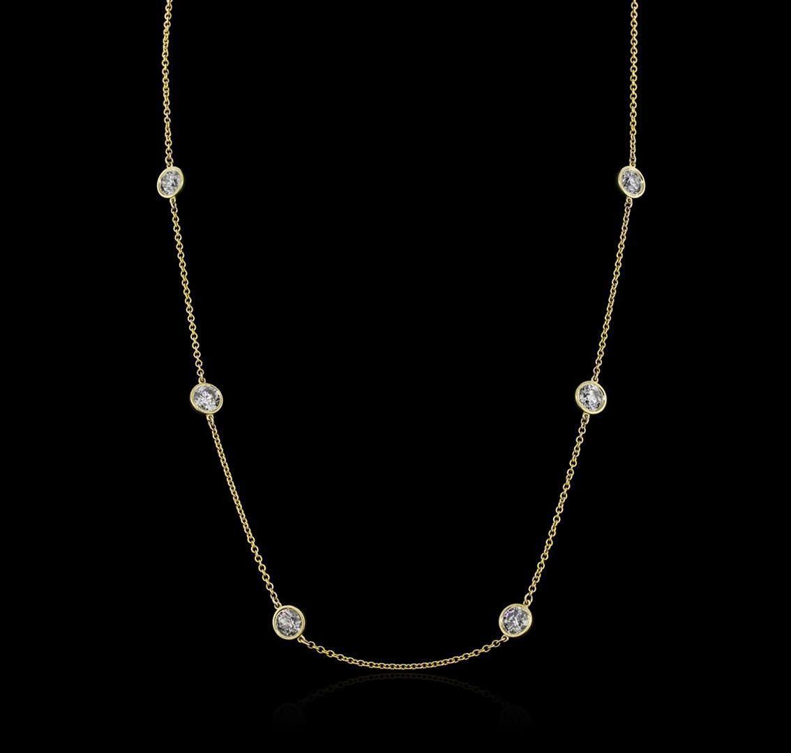 One electronically tested 14KT yellow gold ladies cast diamond necklace with a lobster claw clasp with a bright polish finish. Measurements: 18" in length Identified with markings of "14K". Condition is new. Containing: Eight bezel set round brilliant cut diamonds, measuring 5.50 - 5.50 x 3.30mm (depth est.) approximate total weight of 8 Stones = 4.87ct. Clarity: I-3. Color: H - I, Cut is Good. Diamonds are graded in the mounting, unless otherwise stated. Total Weight of Diamonds 4.87ct. Total Weight of Necklace 5.30 grams. GGL Appraised.