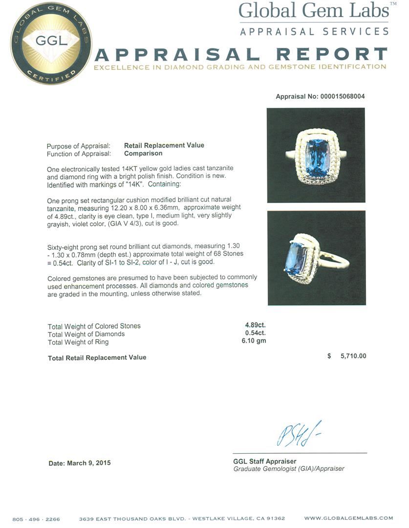 One electronically tested 14KT yellow gold ladies cast tanzanite and diamond ring with a bright polish finish. Identified with markings of "14K". Condition is new. Containing: One prong set rectangular cushion modified brilliant cut natural tanzanite, measuring 12.20 x 8.00 x 6.36mm, approximate weight of 4.89ct., clarity is eye clean, type I, medium light, very slightly grayish, violet color, (GIA V 4/3), cut is good. Sixty-Eight prong set round brilliant cut diamonds, measuring 1.30 - 1.30 x 0.78mm (depth est.) approximate total weight of 68 Stones = 0.54ct. Clarity: SI-1 to SI-2. Color: I - J, Cut is Good. Colored gemstones are presumed to have been subjected to commonly used enhancement processes. All diamonds and colored gemstones are graded in the mounting, unless otherwise stated. Total Weight of Colored Stones 4.89ct. Total Weight of Diamonds 0.54ct. Total Weight of Ring 6.10 grams. GGL Appraised at $5,710.00.