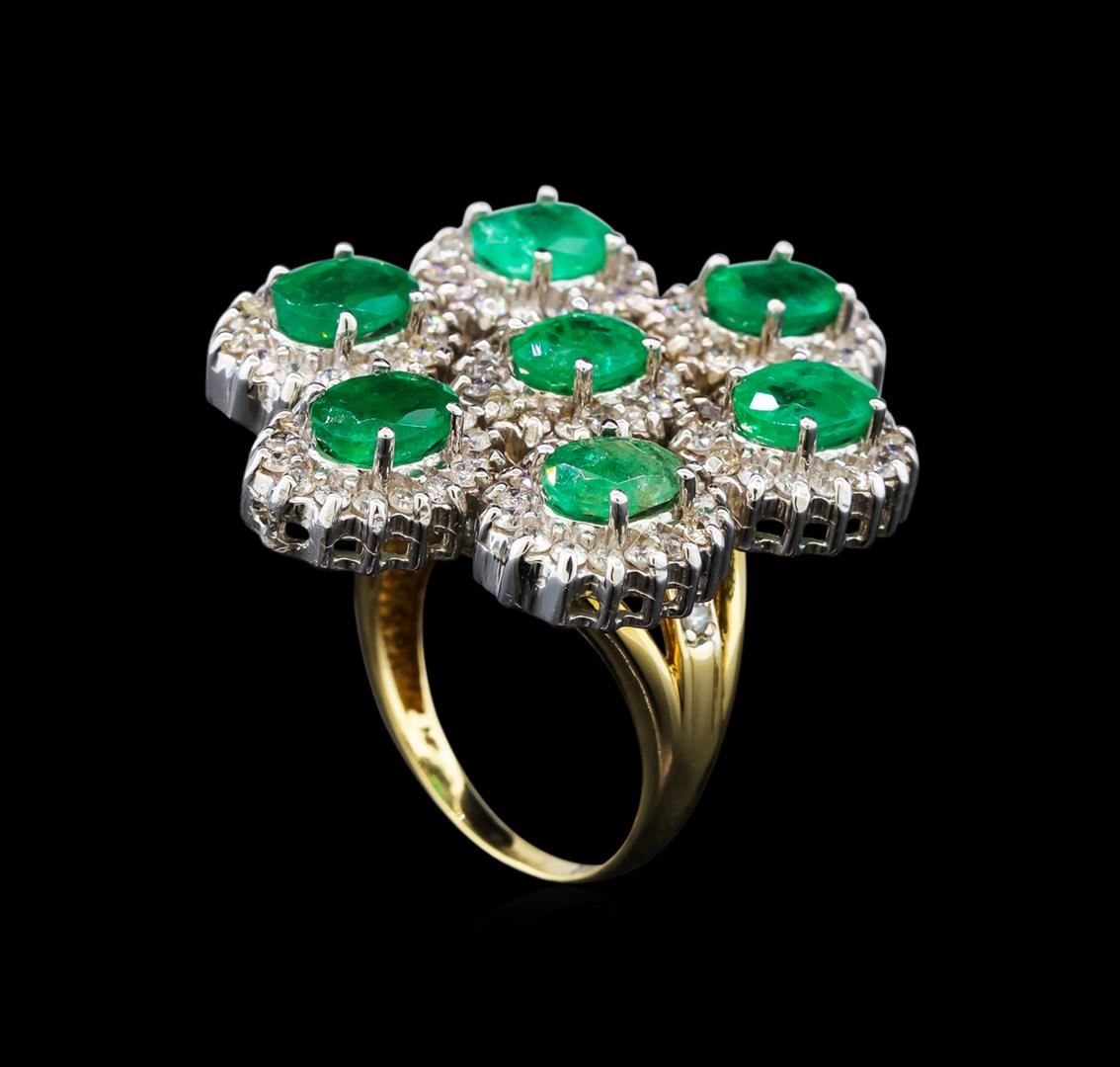 One electronically tested 14KT yellow gold ladies cast emerald and diamond ring with a bright polish finish. Identified with markings of "14K". Condition is very good. Containing: Seven prong set oval modified brilliant cut natural emeralds, measuring 7.00 x 5.20 x 3.38mm, approximate total weight of 4.90ct., clarity is heavily included, type III, medium, very slightly grayish, green color, (GIA G 5/3)One Hundred Twelve prong set round brilliant cut diamonds, measuring 1.50 - 1.50 x 0.90mm (depth est.) approximate total weight of 112 Stones = 1.38ct. Clarity: I-1 to I-2. Color: I - J. Colored gemstones are presumed to have been subjected to commonly used enhancement processes. All diamonds and colored gemstones are graded in the mounting, unless otherwise stated. Total Weight of Colored Stones 4.90ct. Total Weight of Diamonds 1.38ct. Total Weight of Ring 14.30 grams. GGL Appraised at $4,665.00.