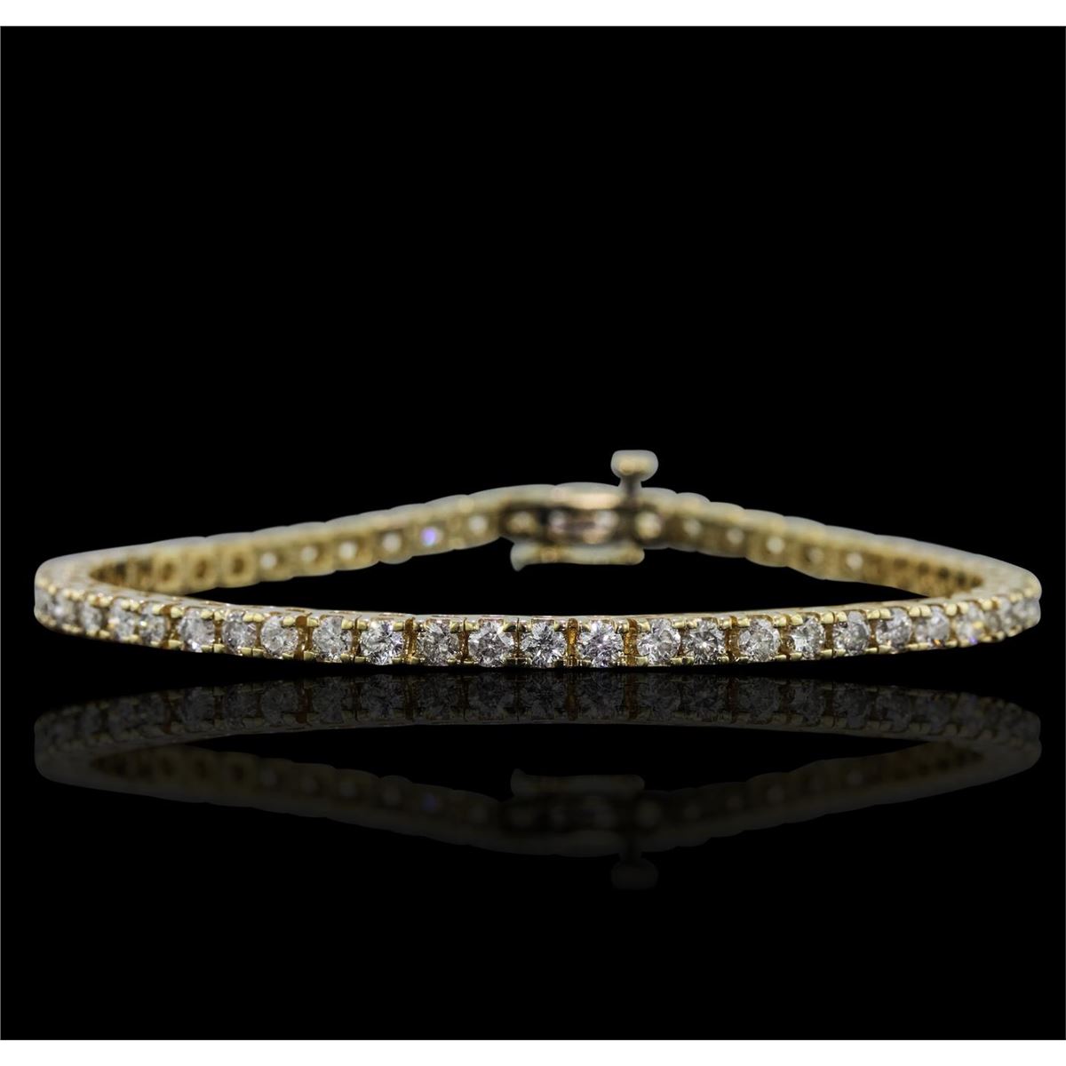 One electronically tested 14KT yellow gold Ladies combination cast & assembled tennis bracelet with a hidden box clasp with a bright polish finish. Condition is new. Measurements: 7" in length. Identified with markings of "14K". Containing: Fifty-Five prong set round brilliant cut diamonds, measuring 2.90 - 2.90 x 1.74mm (depth est.) approximate. Total Weight of 55 Stones = 4.91ct. Clarity: I-2 to I-3. Color: H - I, Cut is Good. Total Weight of Diamonds 4.91ct. Total Weight of Bracelet 12.50 grams. GGL Appraised at $11,230.00.