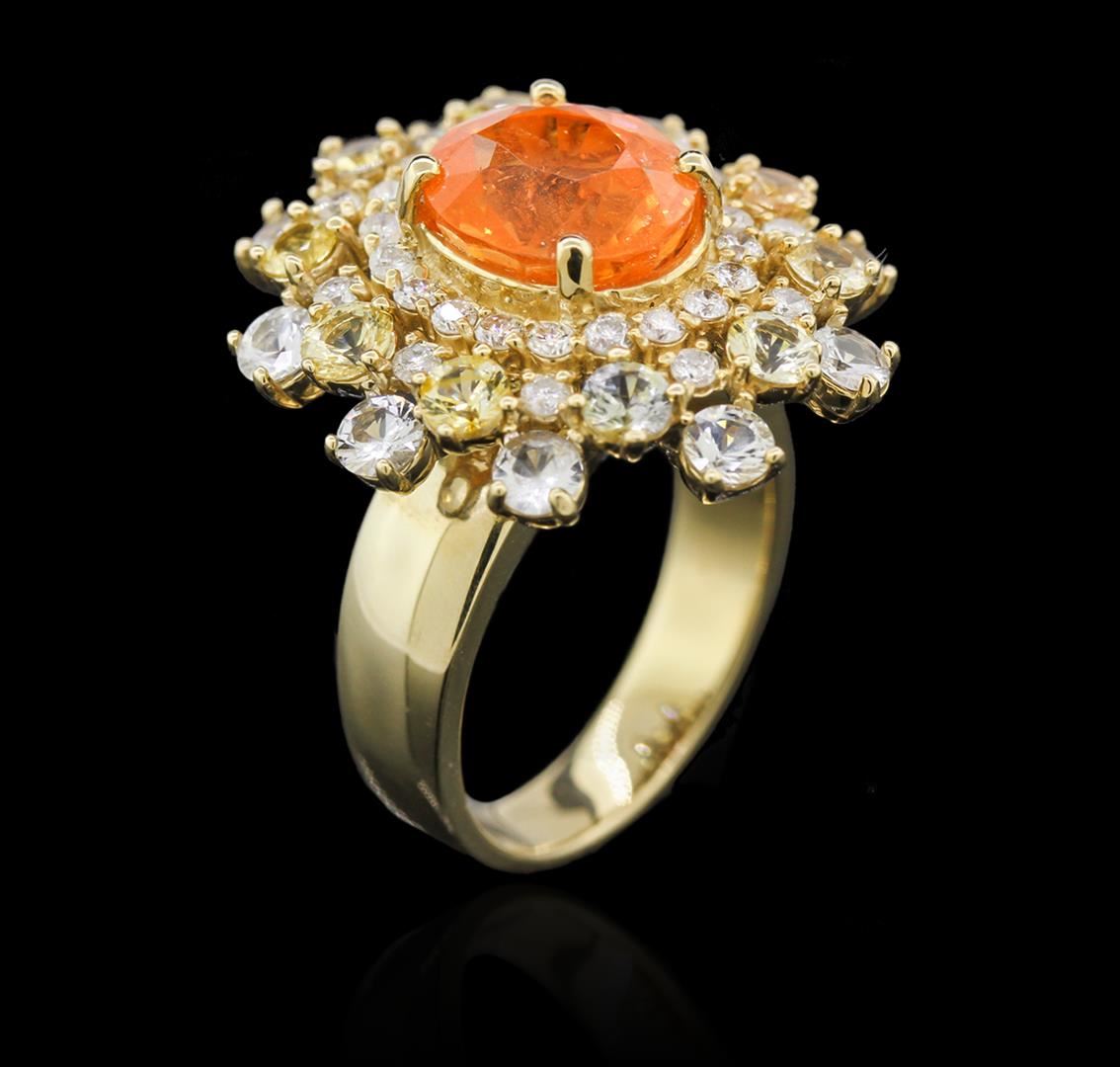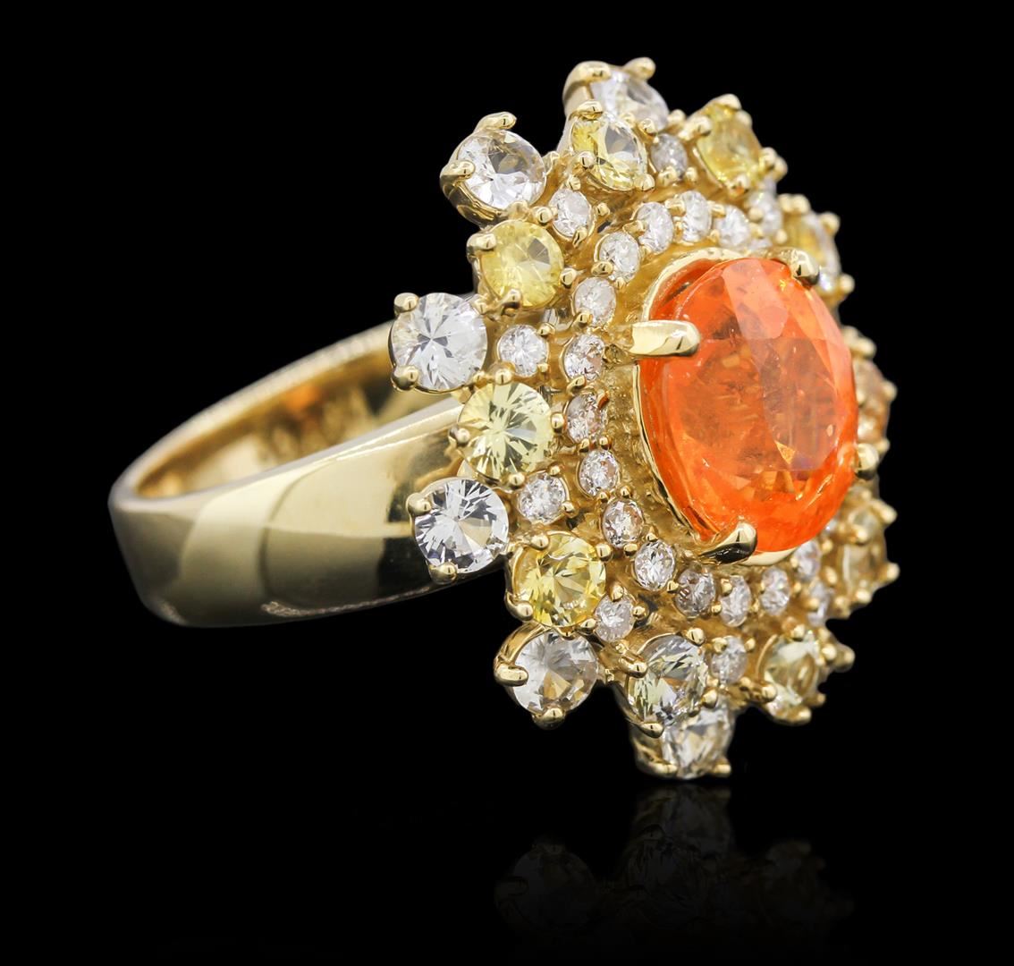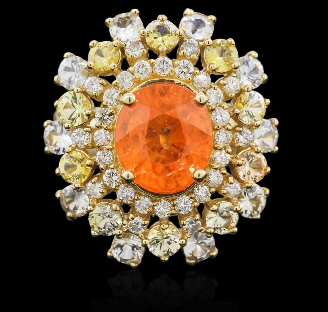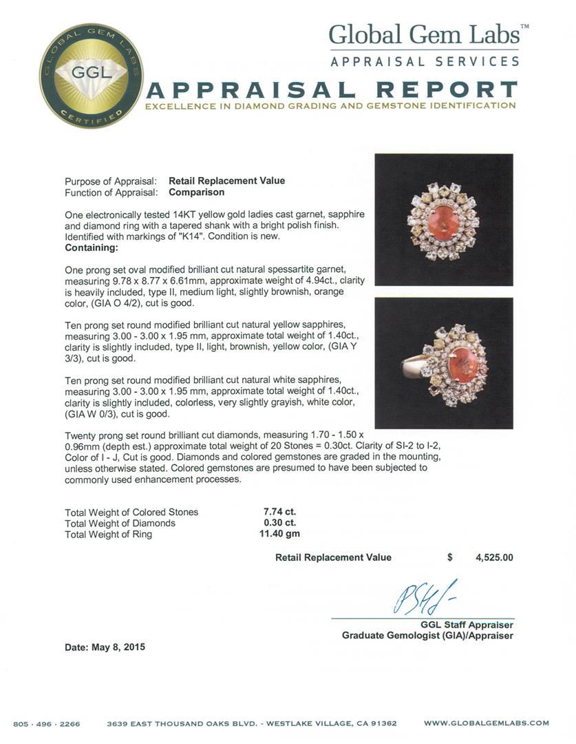 One electronically tested 14KT yellow gold ladies cast garnet, sapphire and diamond ring with a tapered shank with a bright polish finish. Identified with markings of "K14". Condition is new. Containing: One prong set oval modified brilliant cut natural spessartite garnet, measuring 9.78 x 8.77 x 6.61mm, approximate weight of 4.94ct., clarity is heavily included, type II, medium light, slightly brownish, orange color, (GIA O 4/2), cut is good. Ten prong set round modified brilliant cut natural yellow sapphires, measuring 3.00 - 3.00 x 1.95 mm, approximate total weight of 1.40ct., clarity is slightly included, type II, light, brownish, yellow color, (GIA Y 3/3), cut is good. Ten prong set round modified brilliant cut natural white sapphires, measuring 3.00 - 3.00 x 1.95 mm, approximate total weight of 1.40ct., clarity is slightly included, colorless, very slightly grayish, white color, (GIA W 0/3), cut is good. Twenty prong set round brilliant cut diamonds, measuring 1.70 - 1.50 x 0.96mm (depth est.) approximate total weight of 20 Stones = 0.30ct. Clarity: SI-2 to I-2. Color: I - J, Cut is Good. Diamonds and colored gemstones are graded in the mounting, unless otherwise stated. Colored gemstones are presumed to have been subjected to commonly used enhancement processes. Total Weight of Colored Stones 7.74ct. Total Weight of Diamonds 0.30ct. Total Weight of Ring 11.40 grams. GGL Appraised at $4,525.00.