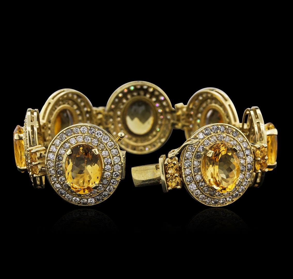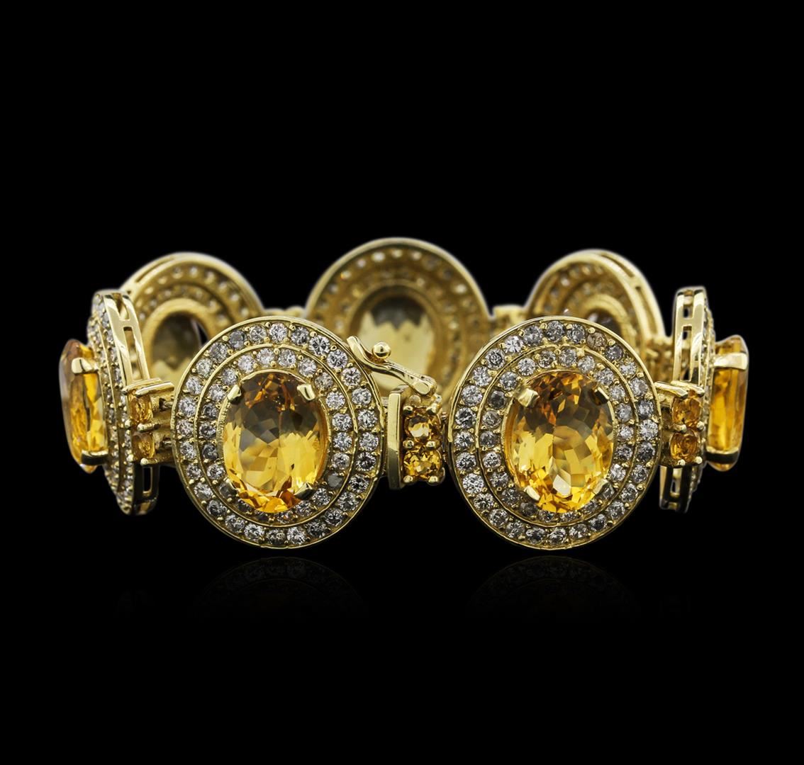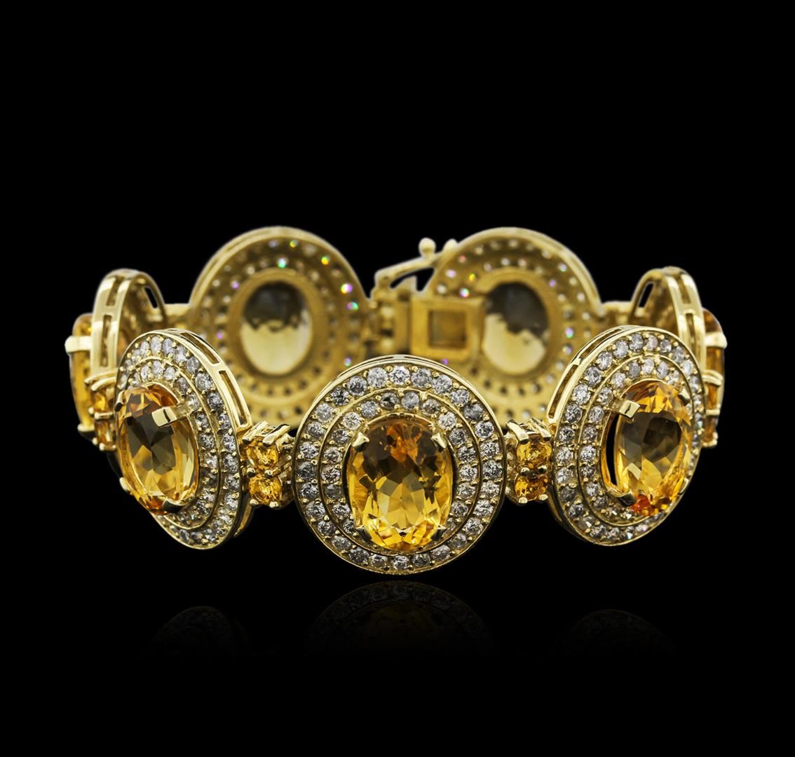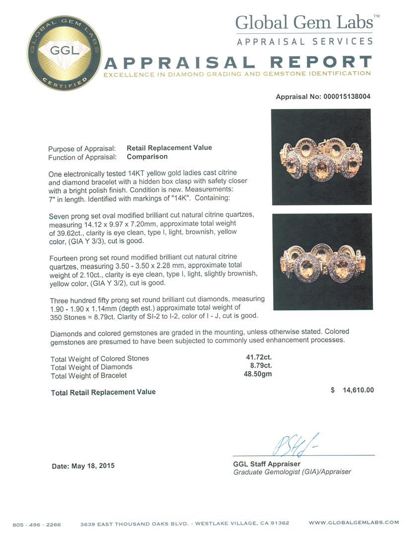 One electronically tested 14KT yellow gold ladies cast citrine and diamond bracelet with a hidden box clasp with safety closer with a bright polish finish. Measurements: 7" in length. Identified with markings of "14K". Condition is new. Containing: Seven prong set oval modified brilliant cut natural citrine quartzes, measuring 14.12 x 9.97 x 7.20mm, approximate total weight of 39.62ct., clarity is eye clean, type I, light, brownish, yellow color, (GIA Y 3/3), cut is good. Fourteen prong set round modified brilliant cut natural citrine quartzes, measuring 3.50 - 3.50 x 2.28 mm, approximate total weight of 2.10ct., clarity is eye clean, type I, light, slightly brownish, yellow color, (GIA Y 3/2), cut is good. Three Hundred Fifty prong set round brilliant cut diamonds, measuring 1.90 - 1.90 x 1.14mm (depth est.) approximate total weight of 350 Stones = 8.79ct. Clarity: SI-2 to I-2. Color: I - J, Cut is Good. Diamonds and colored gemstones are graded in the mounting, unless otherwise stated. Colored gemstones are presumed to have been subjected to commonly used enhancement processes. Total Weight of Colored Stones 41.72ct. Total Weight of Diamonds 8.79ct. Total Weight of Bracelet 48.50 grams. GGL Appraised at $14,610.00.