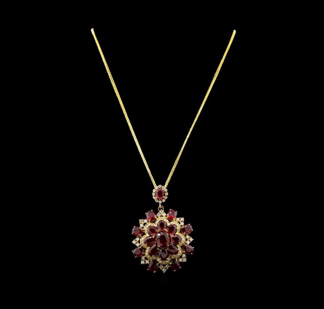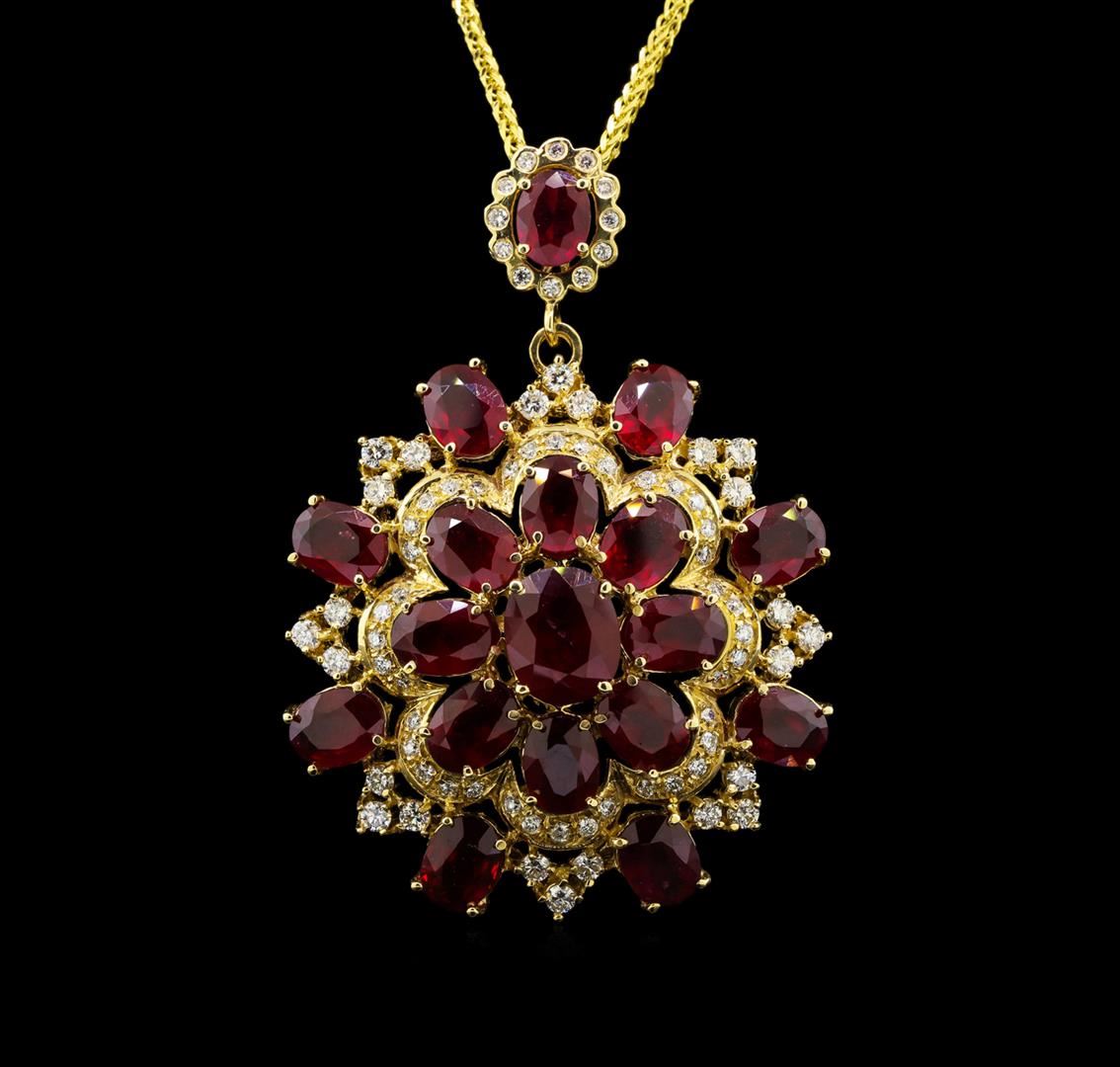 One electronically tested 14KT yellow gold ladies cast ruby and diamond pendant & chain 20.0" long, with a lobster claw clasp with a bright polish finish. Identified with markings of "14K". Condition is new. Containing: One prong set oval modified brilliant cut natural ruby, measuring 11.00. x 9.00. x 5.85mm, approximate weight of 4.86ct., clarity is heavily included, type II, medium dark, moderately strong, strongly purplish red color, (GIA stpR 6/4), cut is good. Seventeen prong set round modified brilliant cut natural rubies, measuring 8.00. - 6.00. x 4.55 mm, approximate total weight of 39.61ct., clarity is moderately included, type II, medium dark, moderately strong, strongly purplish red color, (GIA stpR 6/4), cut is good. Twenty-Four prong set round brilliant cut diamonds, measuring 2.50 - 2.50 x 1.50mm (depth est.) approximate total weight of 24 Stones = 1.37ct. Clarity: SI-1 to SI-2. Color: J - K, Cut is Good. Fifty-Two prong set round brilliant cut diamonds, measuring 1.30 - 1.30 x 0.78mm (depth est.) approximate total weight of 52 Stones = 0.42ct. Clarity: SI-1 to SI-2. Color: J - K, Cut is Good. Colored gemstones are presumed to have been subjected to commonly used enhancement processes. All diamonds and colored gemstones are graded in the mounting, unless otherwise stated. Total Weight of Colored Stones 44.47ct. Total Weight of Diamonds 1.79ct. Total Weight of Pendant & Chain 29.60 grams. GGL Appraised at $8,510.00.