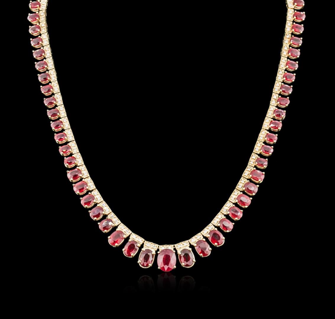 One electronically tested 14KT yellow gold ladies cast ruby and diamond necklace with a hidden box clasp with safety closer with a bright polish finish. Measurements: 17" in length Identified with markings of "14K". Condition is new. Containing: One prong set oval modified brilliant cut natural ruby, measuring 10.50 x 8.50 x 6.00mm, approximate total weight of 4.50ct., clarity is heavily included, type II, medium dark, moderately strong, strongly purplish red color, (GIA stpR 6/4), cut is good. Thirteen prong set round brilliant cut diamonds, measuring 1.50 - 1.50 x 0.90mm (depth est.) approximate total weight of 13 Stones = 0.16ct. Clarity: SI-1 to SI-2. Color: I - J, Cut is Good. Colored gemstones are presumed to have been subjected to commonly used enhancement processes. All diamonds and colored gemstones are graded in the mounting, unless otherwise stated. Six prong set oval modified brilliant cut natural rubies, measuring 8.00 x 6.00 x 3.90mm, approximate total weight of 9.54ct., clarity is heavily included, medium dark, moderately strong, strongly purplish red color, (GIA stpR 6/4), cut is good. Ten prong set oval modified brilliant cut natural rubies, measuring 7.00 x 5.00 x 3.25mm, approximate total weight of 9.70ct., clarity is heavily included, medium dark, moderately strong, strongly purplish red color, (GIA stpR 6/4), cut is good. Forty-six prong set oval modified brilliant cut natural rubies, measuring 6.00 x 4.00 x 2.60mm, approximate total weight of 24.38ct., clarity is heavily included, medium dark, moderately strong, strongly purplish red color, (GIA stpR 6/4), cut is good. Total Weight of Colored Stones 48.12ct. Total Weight of Diamonds 0.16ct. Total Weight of Necklace 57.40 grams. GGL Appraised at $14,350.00.