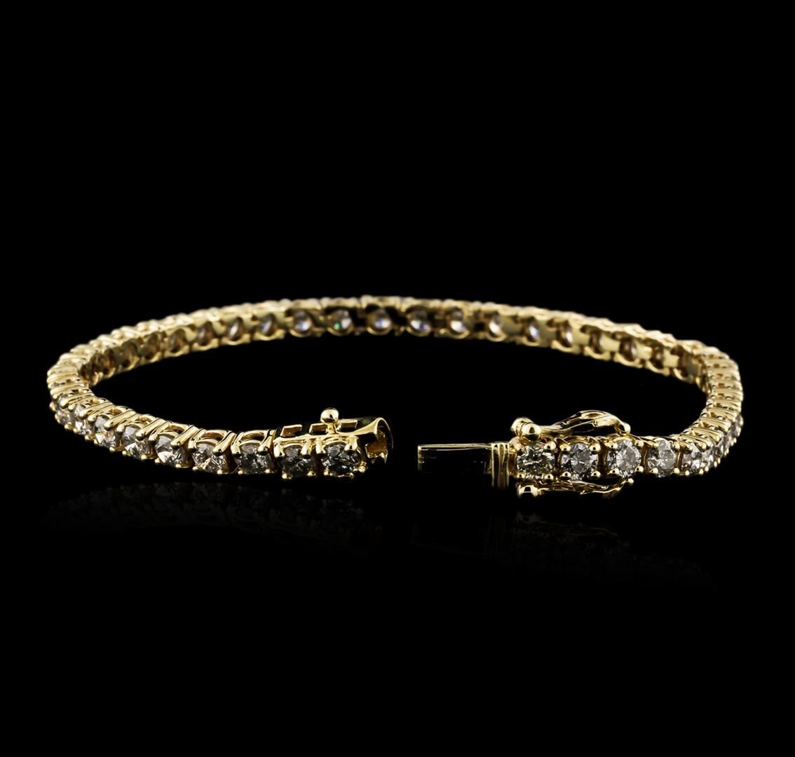 One electronically tested 14KT yellow gold ladies cast diamond tennis bracelet with a hidden box clasp with safety closer with a bright polish finish. Measurements: 7" in length Identified with markings of "14K". Condition is new. Containing: Forty-Six prong set round brilliant cut diamonds, measuring 3.10 - 3.10 x 1.86mm (depth est.) approximate total weight of 46 Stones = 5.01ct. Clarity: I-2 to I-3. Color: I - J, Cut is Good. All diamonds are graded in the mounting, unless otherwise stated. Total Weight of Diamonds 5.01ct. Total Weight of Tennis Bracelet 10.90 grams. GGL Appraised at $8,365.00.