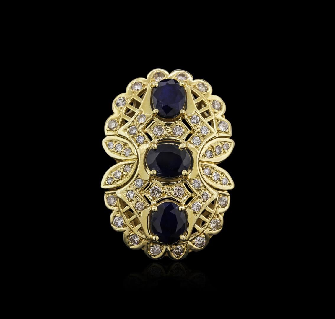 One electronically tested 14KT yellow gold ladies cast sapphire and diamond ring with a bright polish finish. Identified with markings of "14K". Condition is new. Containing: Three prong set oval oval modified brilliant cut natural blue sapphires, measuring 8.20 x 6.10 x 3.97mm, approximate total weight of 5.01ct., clarity is heavily included, type II, dark, moderately strong, blue color, (GIA B 7/4), cut is good. Forty-Four prong set round brilliant cut diamonds, measuring 2.00 - 2.00 x 1.20mm (depth est.) approximate total weight of 44 Stones = 1.29ct. Clarity: SI-1 to I-1. Color: K - L, Cut is Good. Diamonds and colored gemstones are graded in the mounting, unless otherwise stated. Colored gemstones are presumed to have been subjected to commonly used enhancement processes. Total Weight of Colored Stones 5.01ct. Total Weight of Diamonds 1.29ct. Total Weight of Ring 13.40 grams. GGL Appraised at $5,875.00.