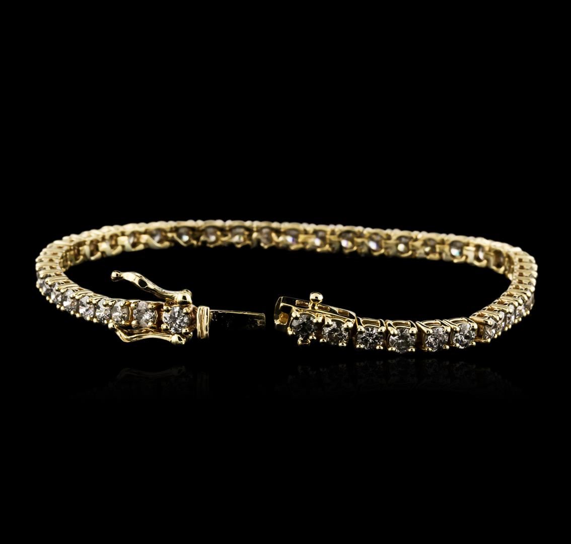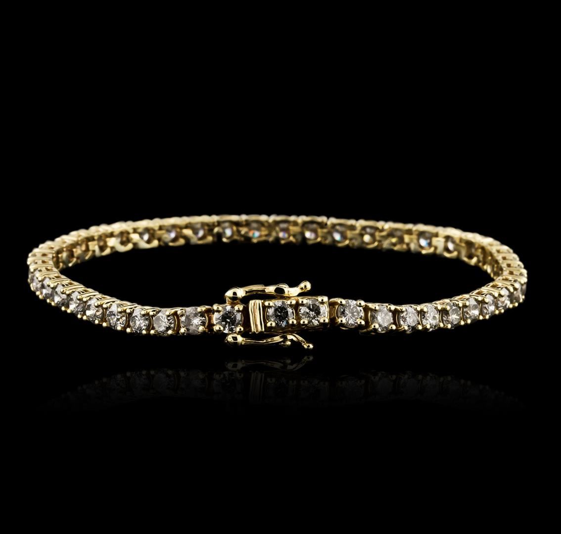 One electronically tested 14KT yellow gold ladies cast diamond tennis bracelet with a hidden box clasp with safety closer with a bright polish finish. Measurements: 7" in length Identified with markings of "14K". Condition is new. Containing: Forty-Six prong set round brilliant cut diamonds, measuring 3.10 - 3.10 x 1.86mm (depth est.) approximate total weight of 46 Stones = 5.01ct. Clarity: I-2 to I-3. Color: I - J, Cut is Good. All diamonds are graded in the mounting, unless otherwise stated. Total Weight of Diamonds 5.01ct. Total Weight of Tennis Bracelet 10.90 grams. GGL Appraised at $8,365.00.