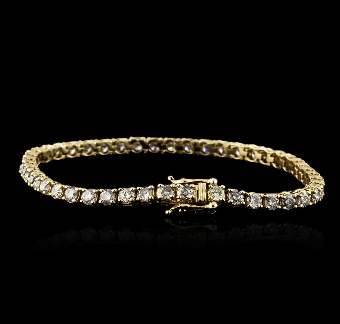 One electronically tested 14KT yellow gold ladies cast diamond tennis bracelet with a hidden box clasp with safety closer with a bright polish finish. Measurements: 7" in length Identified with markings of "14K". Condition is new. Containing: Forty-Six prong set round brilliant cut diamonds, measuring 3.10 - 3.10 x 1.86mm (depth est.) approximate total weight of 46 Stones = 5.01ct. Clarity: I-2 to I-3. Color: I - J, Cut is Good. All diamonds are graded in the mounting, unless otherwise stated. Total Weight of Diamonds 5.01ct. Total Weight of Tennis Bracelet 10.90 grams. GGL Appraised at $8,365.00.