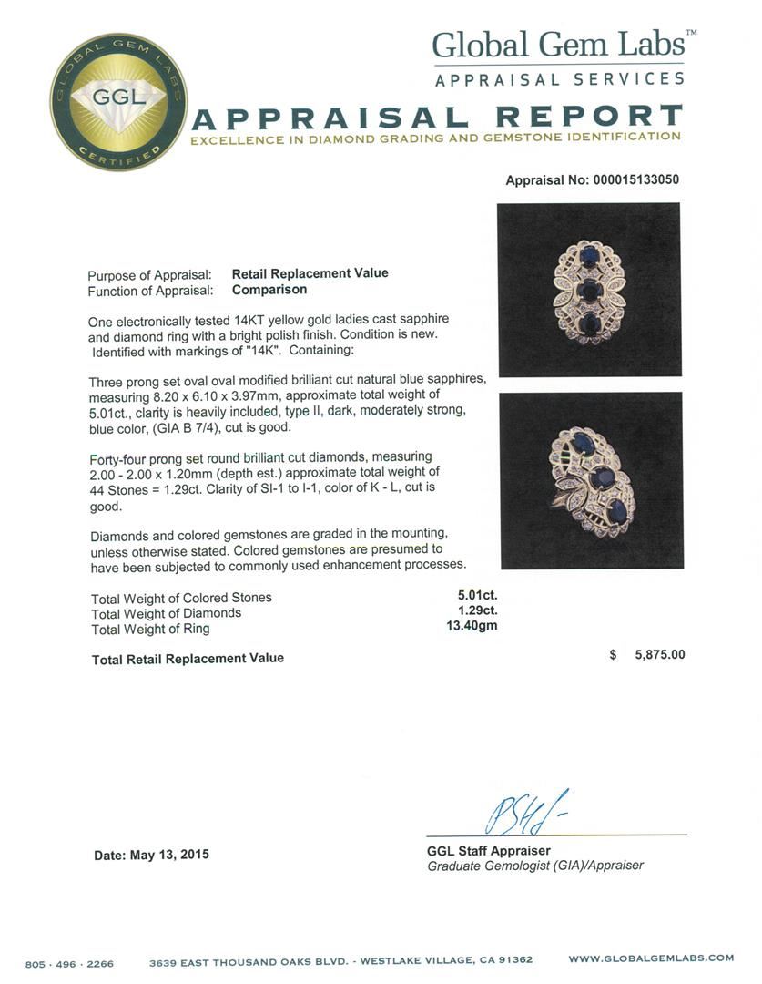 One electronically tested 14KT yellow gold ladies cast sapphire and diamond ring with a bright polish finish. Identified with markings of "14K". Condition is new. Containing: Three prong set oval oval modified brilliant cut natural blue sapphires, measuring 8.20 x 6.10 x 3.97mm, approximate total weight of 5.01ct., clarity is heavily included, type II, dark, moderately strong, blue color, (GIA B 7/4), cut is good. Forty-Four prong set round brilliant cut diamonds, measuring 2.00 - 2.00 x 1.20mm (depth est.) approximate total weight of 44 Stones = 1.29ct. Clarity: SI-1 to I-1. Color: K - L, Cut is Good. Diamonds and colored gemstones are graded in the mounting, unless otherwise stated. Colored gemstones are presumed to have been subjected to commonly used enhancement processes. Total Weight of Colored Stones 5.01ct. Total Weight of Diamonds 1.29ct. Total Weight of Ring 13.40 grams. GGL Appraised at $5,875.00.
