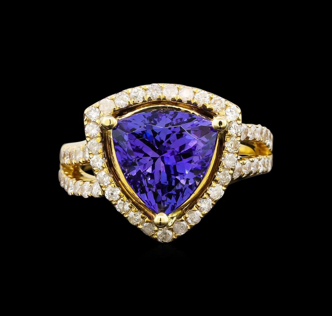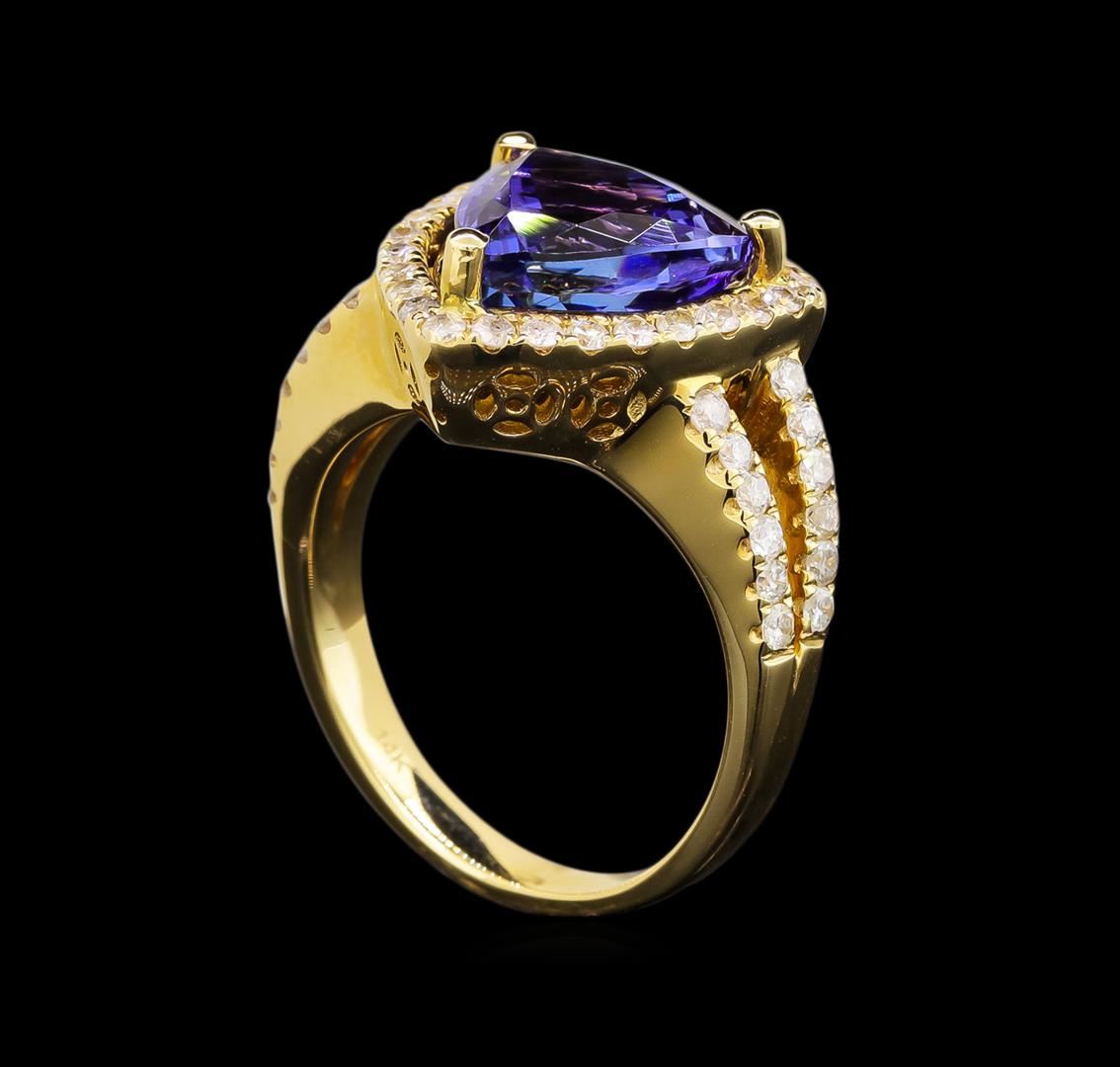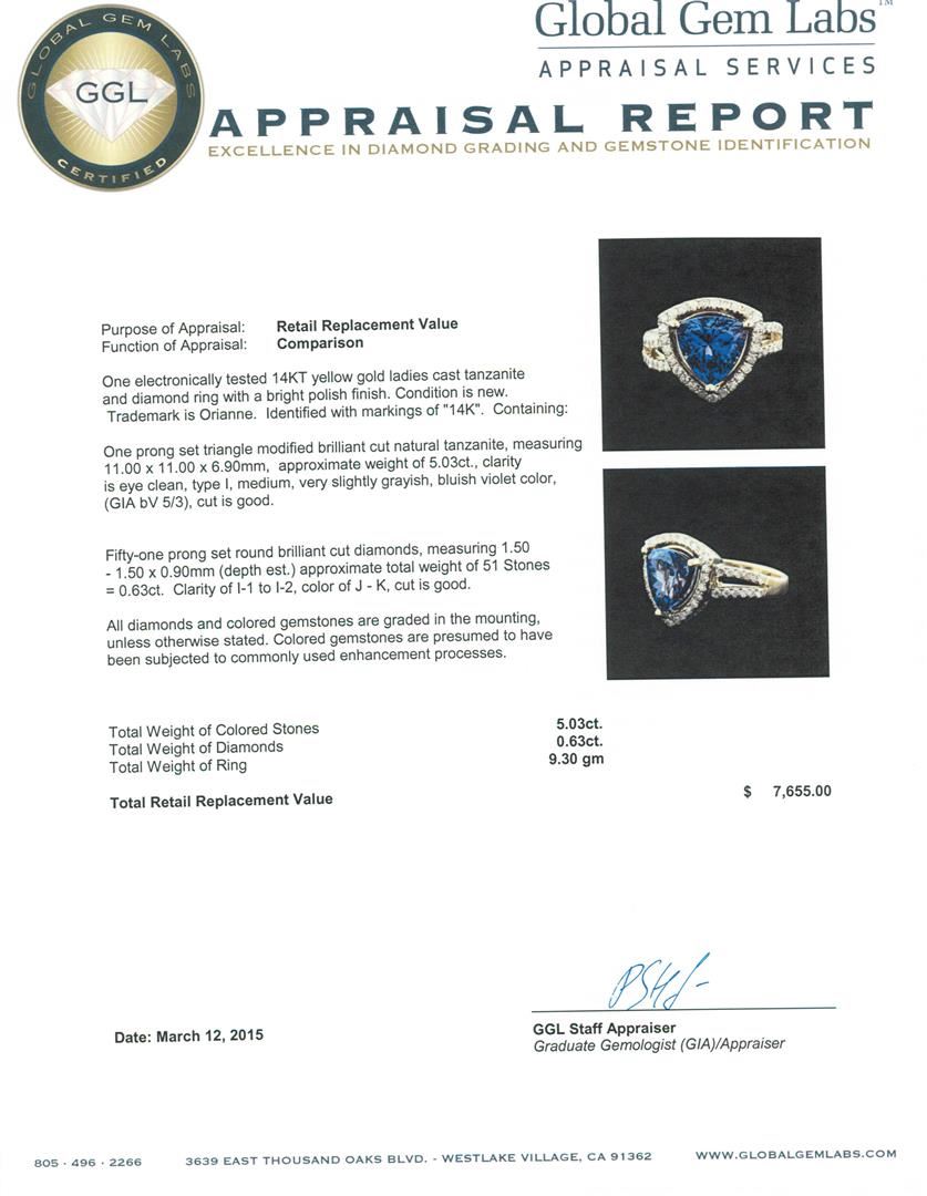 One electronically tested 14KT yellow gold ladies cast tanzanite and diamond ring with a bright polish finish. Trademark is Orianne. Identified with markings of "14K". Condition is new. Containing: One prong set triangle modified brilliant cut natural tanzanite, measuring 11.00 x 11.00 x 6.90mm, approximate weight of 5.03ct., clarity is eye clean, type I, medium, very slightly grayish, bluish violet color, (GIA bV 5/3), cut is good. Fifty-One prong set round brilliant cut diamonds, measuring 1.50 - 1.50 x 0.90mm (depth est.) approximate total weight of 51 Stones = 0.63ct. Clarity: I-1 to I-2. Color: J - K, Cut is Good. All diamonds and colored gemstones are graded in the mounting, unless otherwise stated. Colored gemstones are presumed to have been subjected to commonly used enhancement processes.. Total Weight of Colored Stones 5.03ct. Total Weight of Diamonds 0.63ct. Total Weight of Ring 9.30 grams. GGL Appraised at $7,655.00.