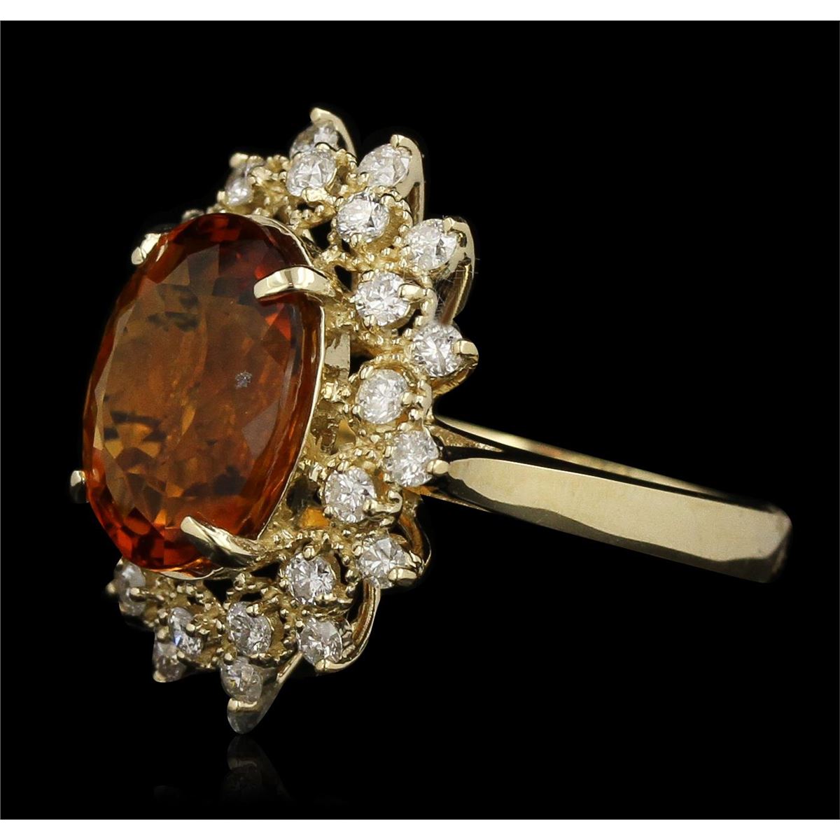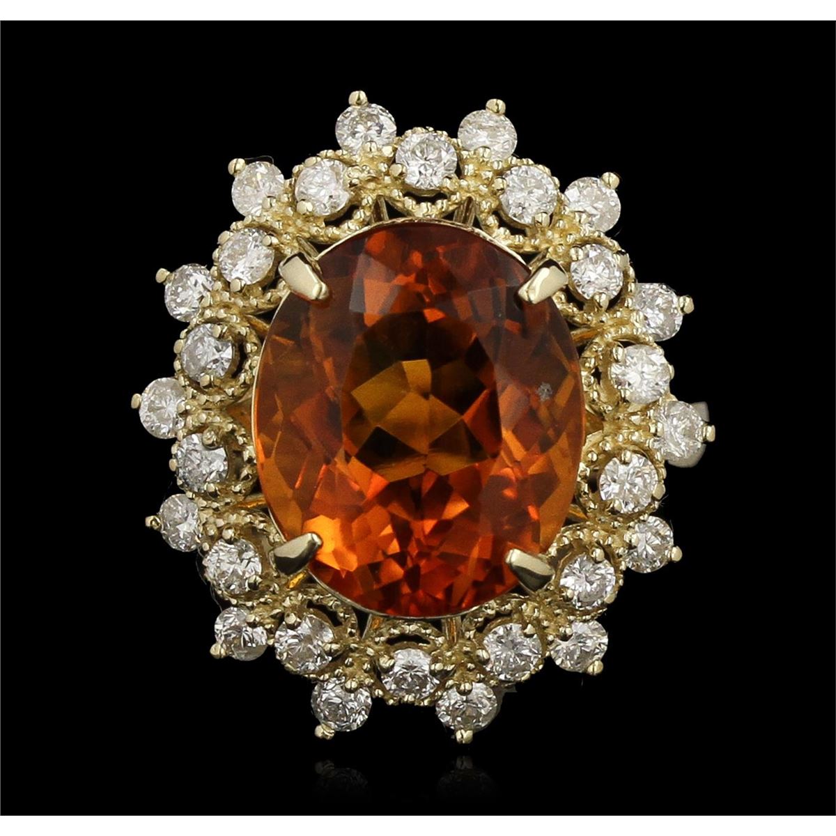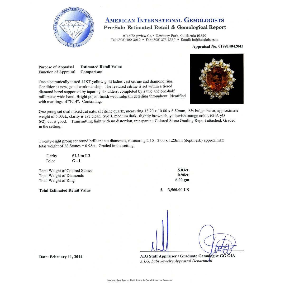 One electronically tested 14KT yellow gold ladies cast citrine and diamond ring. Condition is new, good workmanship. The featured citrine is set within a tiered diamond bezel supported by tapering shoulders, completed by a two and one-half millimeter wide band. Bright polish finish with milgrain detailing throughout. Identified with markings of "K14". Containing: One prong set oval mixed cut natural citrine quartz, measuring 13.20 x 10.00 x 6.50mm, 8% bulge factor, approximate weight of 5.03ct, clarity is eye clean, type I, medium dark, slightly brownish, yellowish orange color, (GIA yO 6/2), cut is good. Transmitting light with no distortion, transparent. Colored Stone Grading Report attached. Graded in the setting. Twenty-Eight prong set round brilliant cut diamonds, measuring 2.10 - 2.00 x 1.23mm (depth est.) approximate. Total Weight of 28 Stones = 0.98ct. Graded in the setting. Clarity: SI-2 to I-2. Color: G - I. Total Weight of Colored Stones 5.03ct. Total Weight of Diamonds 0.98ct. Total Weight of Ring 6.00 grams. AIG Appraised at $3,560.00.