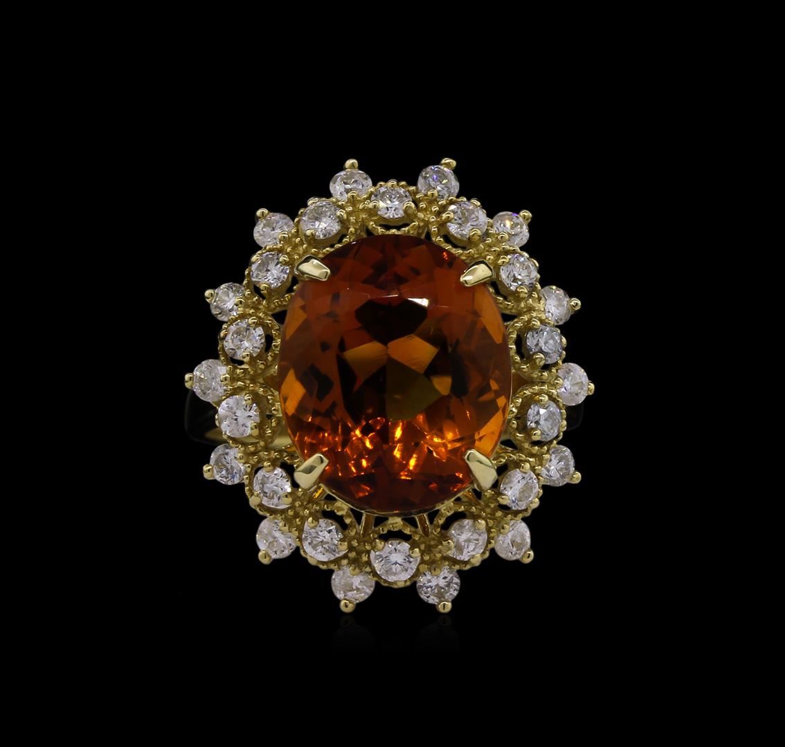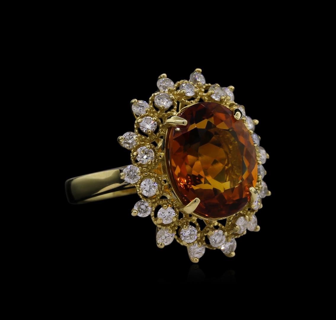 One electronically tested 14KT yellow gold ladies cast citrine and diamond ring. Condition is new, good workmanship. The featured citrine is set within a tiered diamond bezel supported by tapering shoulders, completed by a two and one-half millimeter wide band. Bright polish finish with milgrain detailing throughout. Identified with markings of "K14". Containing: One prong set oval mixed cut natural citrine quartz, measuring 13.20 x 10.00 x 6.50mm, 8% bulge factor, approximate weight of 5.03ct, clarity is eye clean, type I, medium dark, slightly brownish, yellowish orange color, (GIA yO 6/2), cut is good. Transmitting light with no distortion, transparent. Colored Stone Grading Report attached. Graded in the setting. Twenty-Eight prong set round brilliant cut diamonds, measuring 2.10 - 2.00 x 1.23mm (depth est.) approximate. Total Weight of 28 Stones = 0.98ct. Graded in the setting. Clarity: SI-2 to I-2. Color: G - I. Total Weight of Colored Stones 5.03ct. Total Weight of Diamonds 0.98ct. Total Weight of Ring 6.00 grams. AIG Appraised at $3,560.00.