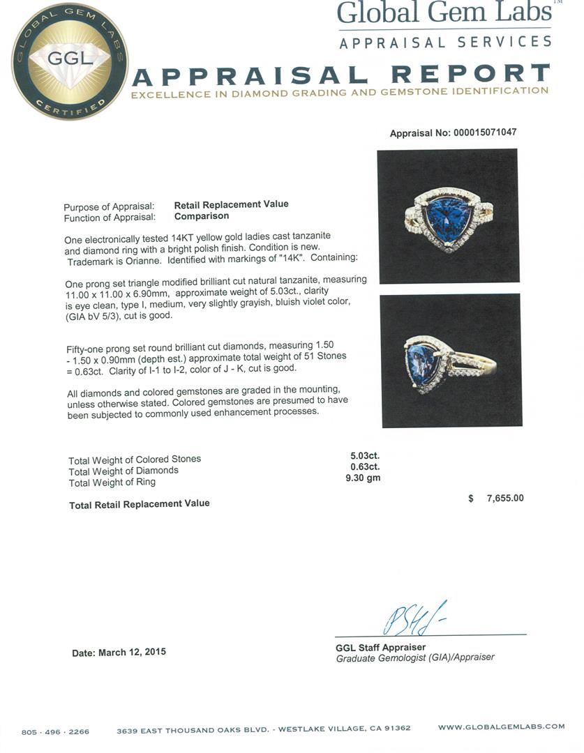 One electronically tested 14KT yellow gold ladies cast tanzanite and diamond ring with a bright polish finish. Trademark is Orianne. Identified with markings of "14K". Condition is new. Containing: One prong set triangle modified brilliant cut natural tanzanite, measuring 11.00 x 11.00 x 6.90mm, approximate weight of 5.03ct., clarity is eye clean, type I, medium, very slightly grayish, bluish violet color, (GIA bV 5/3), cut is good. Fifty-One prong set round brilliant cut diamonds, measuring 1.50 - 1.50 x 0.90mm (depth est.) approximate total weight of 51 Stones = 0.63ct. Clarity: I-1 to I-2. Color: J - K, Cut is Good. All diamonds and colored gemstones are graded in the mounting, unless otherwise stated. Colored gemstones are presumed to have been subjected to commonly used enhancement processes.. Total Weight of Colored Stones 5.03ct. Total Weight of Diamonds 0.63ct. Total Weight of Ring 9.30 grams. GGL Appraised at $7,655.00.