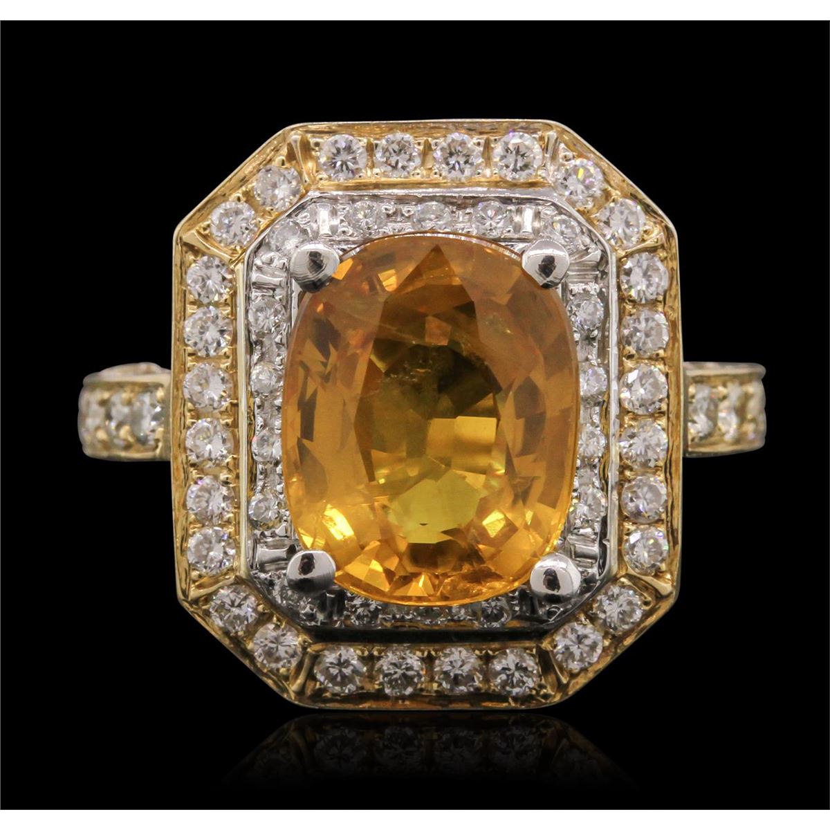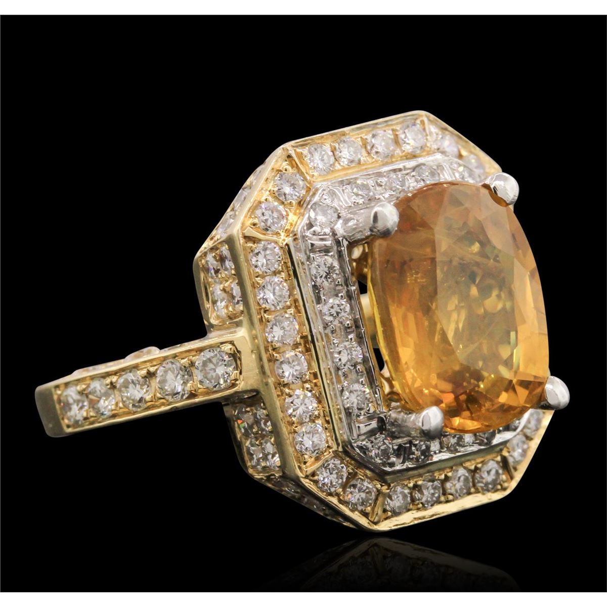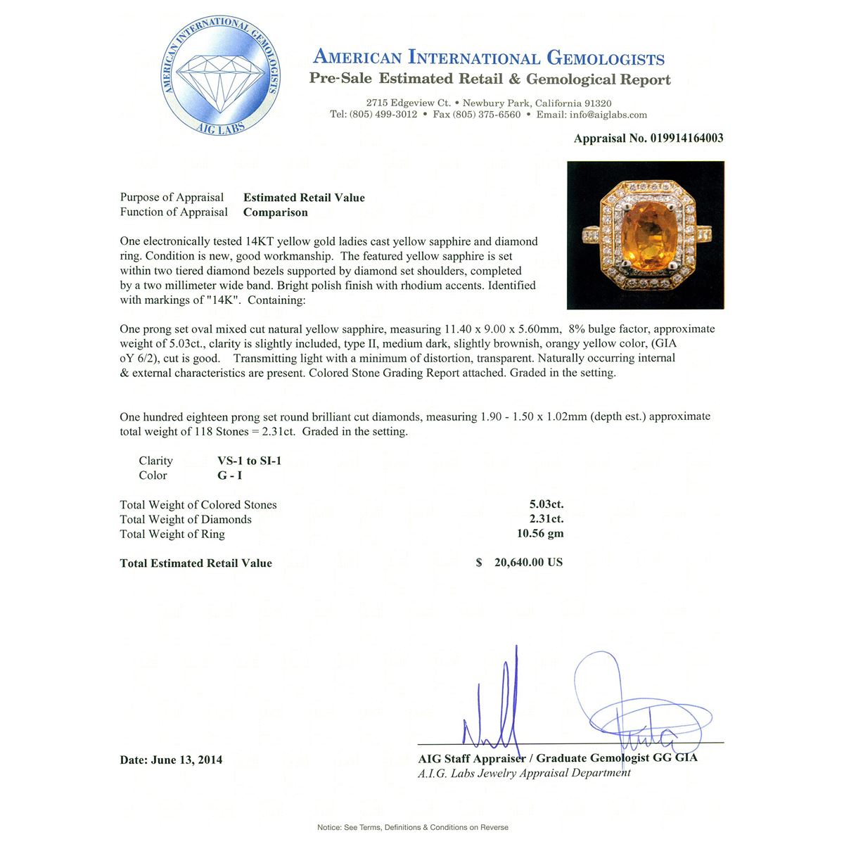One electronically tested 14KT yellow gold ladies cast yellow sapphire and diamond ring. Condition is new, good workmanship. The featured yellow sapphire is set within two tiered diamond bezels supported by diamond set shoulders, completed by a two millimeter wide band. Bright polish finish with rhodium accents. Identified with markings of "14K". Containing: One prong set oval mixed cut natural yellow sapphire, measuring 11.40 x 9.00 x 5.60mm, 8%. bulge factor, approximate weight of 5.03ct., clarity is slightly included, type II, medium dark, slightly brownish, orangy yellow color, (GIA oY 6/2), cut is good. Transmitting light with a minimum of distortion, transparent. Naturally occurring internal & external characteristics are present. Colored Stone Grading Report attached. Graded in the setting.One Hundred Eighteen prong set round brilliant cut diamonds, measuring 1.90 - 1.50 x 1.02mm (depth est.) approximate. Total Weight of 118 Stones = 2.31ct. Graded in the setting. Clarity: VS-1 to SI-1. Color: G - I. Total Weight of Colored Stones 5.03ct. Total Weight of Diamonds 2.31ct. Total Weight of Ring 10.56 grams. AIG Appraised at $20,640.00.