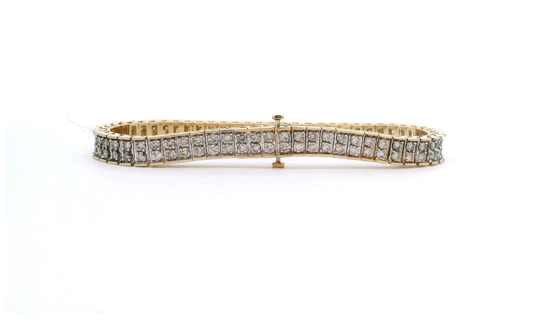 A striking 14KT yellow gold double-row diamond tennis bracelet featuring 122 round brilliant cut diamonds totaling 5.07 carats. Measuring 7 1/4 inches, this elegant bracelet is crafted with a bright polish finish and secured with a tongue clasp for durability and style. Perfect for elevating any look. Estimated Retail Value: $13,800.