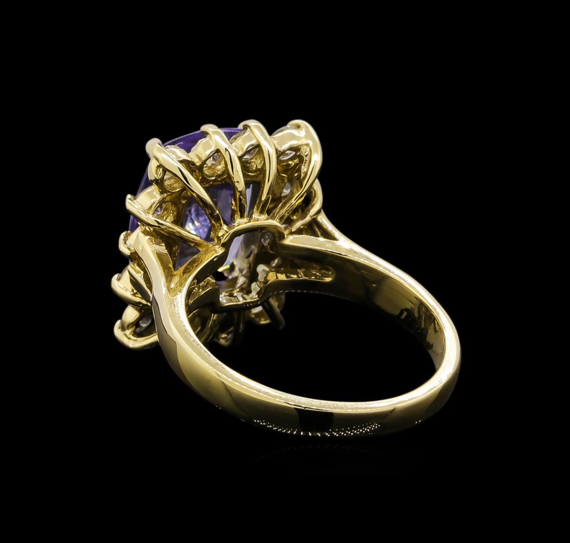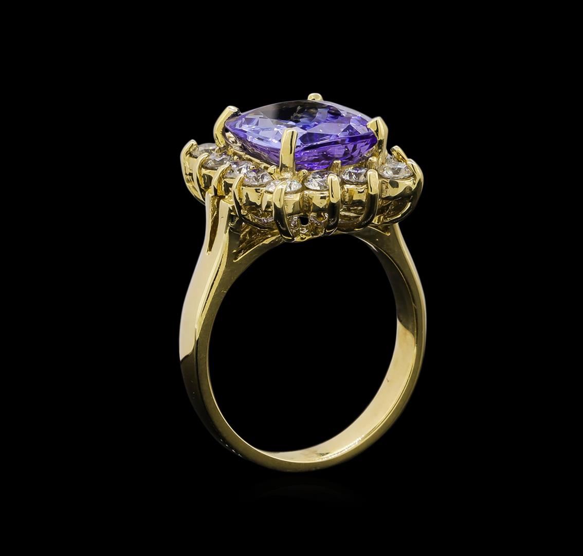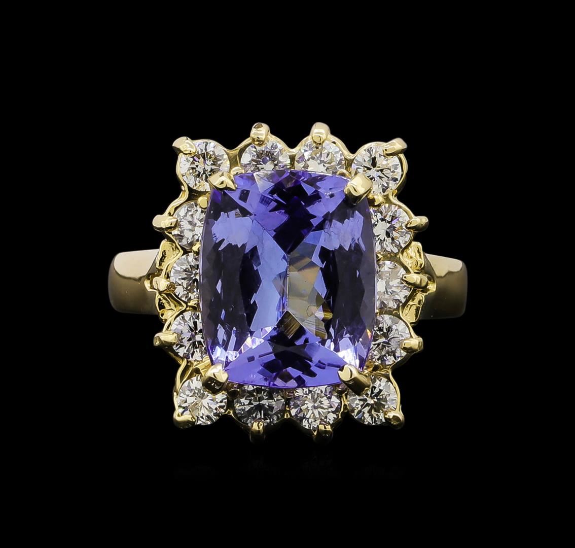 One electronically tested 14KT yellow gold ladies cast tanzanite and diamond ring with a bright polish finish. Identified with markings of "14K". Condition is new. Containing: One prong set rectangular cushion modified brilliant cut natural tanzanite, measuring 11.10 x 9.20 x 6.41mm, approximate weight of 5.15ct., clarity is eye clean, type I, light, very slightly grayish, violet color, (GIA V 3/3), cut is good. Fifteen prong set round brilliant cut diamonds, measuring 2.80 - 2.80 x 1.68mm (depth est.) approximate total weight of 15 Stones = 1.21ct. Clarity: SI-1 to SI-2. Color: I - J, Cut is Good. Colored gemstones are presumed to have been subjected to commonly used enhancement processes. All diamonds and colored gemstones are graded in the mounting, unless otherwise stated. Total Weight of Colored Stones 5.15ct. Total Weight of Diamonds 1.21ct. Total Weight of Ring 6.50 grams. GGL Appraised at $5,860.00.
