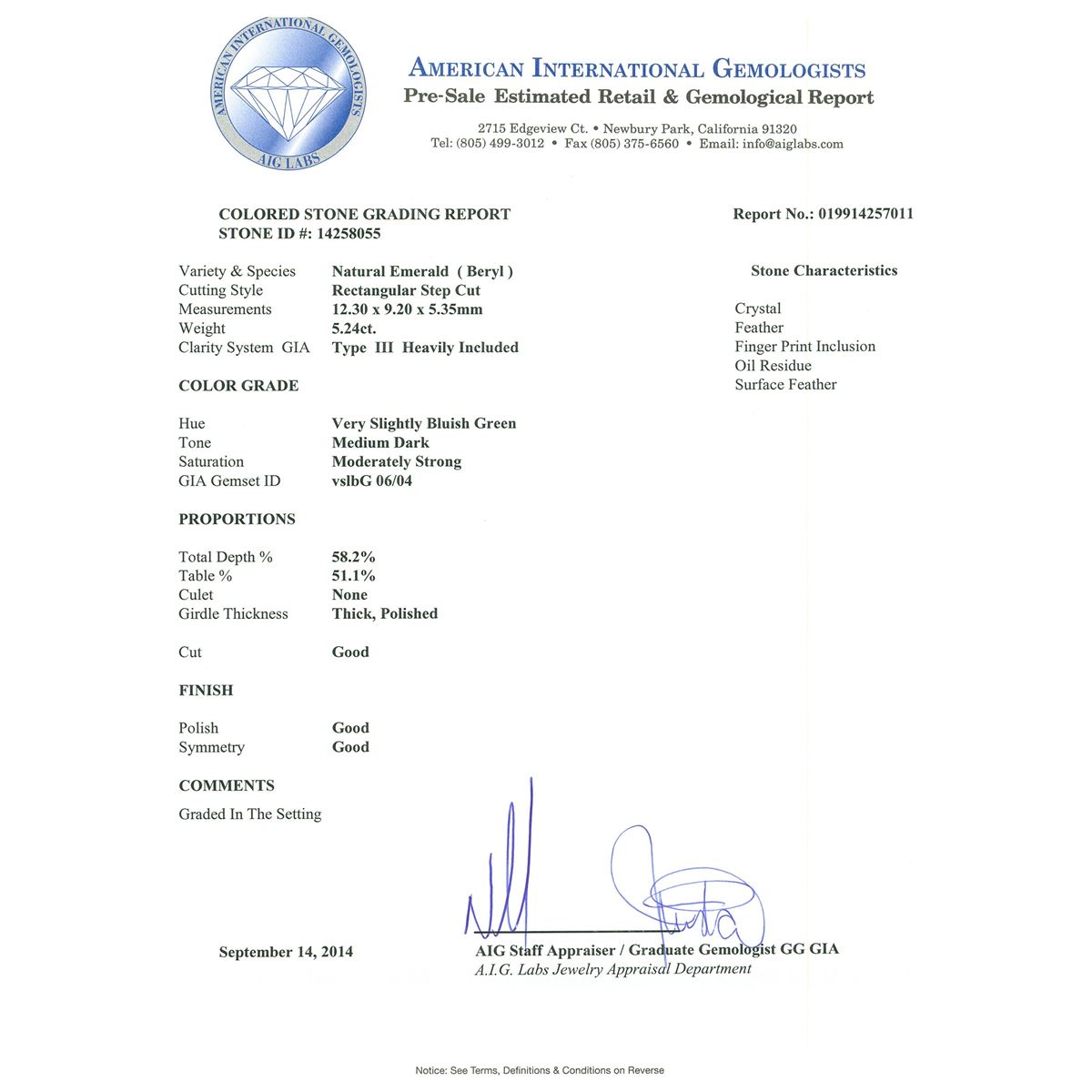 One electronically tested 14KT yellow gold ladies cast emerald and diamond ring with a bright polish finish. The featured emerald is set within two tiered diamond bezels supported by diamond set split shoulders, completed by a three millimeter wide band. Identified with markings of "14K". Condition is new, good workmanship. Containing: One prong set rectangular step cut natural emerald, measuring 12.30 x 9.20 x 5.35mm, 6% bulge factor, approximate weight of 5.24ct., clarity is heavily included, type III, medium dark, moderately strong, very slightly bluish green color, (GIA vslbG 6/4), cut is good. Transmitting light with a minimum of distortion, transparent. Naturally occurring internal & external characteristics are present. Indications of oil residue. Colored Stone Grading Report attached. Graded in the setting. One Hundred Fifty prong set round brilliant cut diamonds, measuring 1.50 - 1.30 x 0.84mm (depth est.) approximate total weight of 150 Stones = 1.60ct. Graded in the setting. Clarity: SI-1 to I-1. Color: G - I. Total Weight of Colored Stones 5.24ct. Total Weight of Diamonds 1.60ct. Total Weight of Ring 8.04 grams. AIG Appraised at $15,170.00.