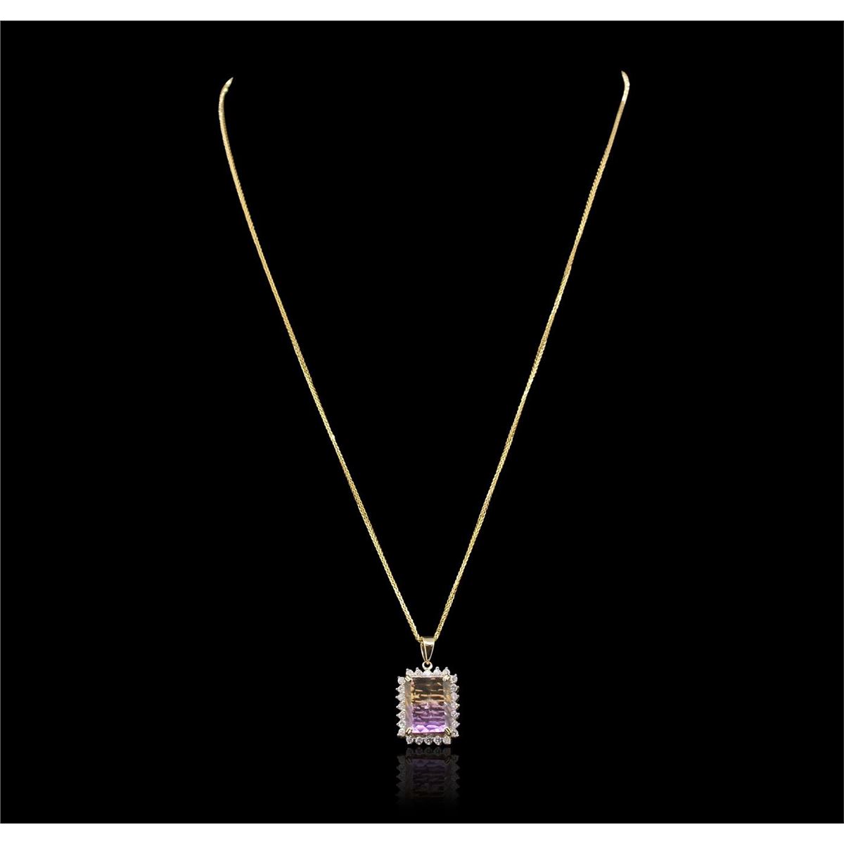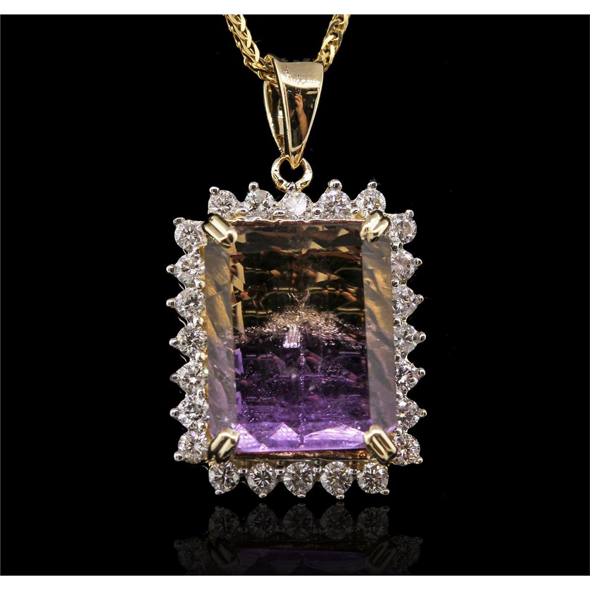One electronically tested 14KT yellow gold Ladies combination cast & die struck pendant & chain 16.0" long, medium fancy cable link with a lobster claw clasp with a bright polish finish. Condition is new. Identified with markings of "14K". Containing: One prong set emerald standard step cut natural ametrine quartz, measuring 12.00 x 10.00 x 6.50mm, approximate weight of 5.29ct., clarity is slightly included, type I, medium light, very slightly grayish, purple color, (GIA P 4/3), cut is good. Colored gemstones are presumed to have been subjected to commonly used color/clarity enhancement processes. Twenty-Four prong set round brilliant cut diamonds, measuring 1.50 - 1.50 x 0.90mm (depth est.) approximate. Total Weight of 24 Stones = 0.47ct. Clarity: SI-2 to I-1. Color: J - K, Cut is Good. Total Weight of Colored Stones 5.29ct. Total Weight of Diamonds 0.47ct. Total Weight of Pendant & Chain 5.10 grams. GGL Appraised at $5,665.00.
