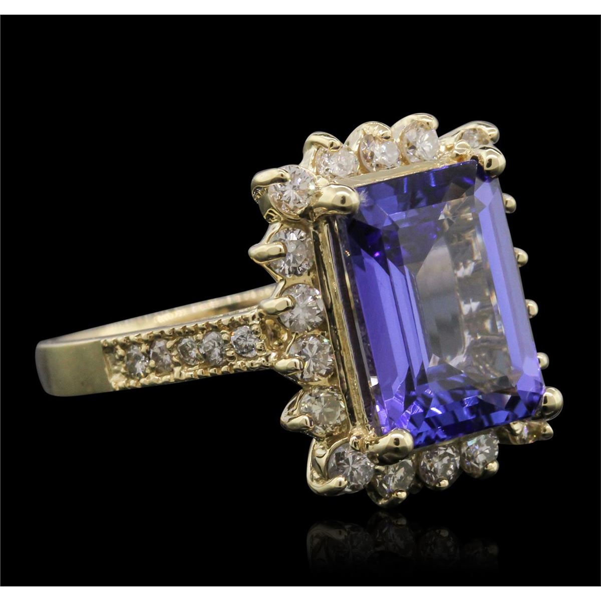 One electronically tested 14KT yellow gold Ladies combination cast & assembled ring with a bright polish finish. Identified with markings of "K14". Condition is new. Containing: One prong set emerald standard step cut natural tanzanite, measuring 12.08 x 9.73 x 5.00mm, approximate weight of 5.32ct., clarity is eye clean, type I, medium light, moderately strong, bluish violet color, (GIA bV 4/4), cut is very good. Colored gemstones are presumed to have been subjected to commonly used color/clarity enhancement processes. Eighteen prong set round brilliant cut diamonds, measuring 2.30 - 2.30 x 1.38mm (depth est.) approximate. Total Weight of 18 Stones = 0.80ct. Clarity: SI-2 to I-1. Color: K - L, Cut is Good. Ten prong set round brilliant cut diamonds, measuring 1.50 - 1.50 x 0.90mm (depth est.) approximate. Total Weight of 10 Stones = 0.12ct. Clarity: SI-2 to I-1. Color: K - L, Cut is Good. Total Weight of Colored Stones 5.32ct. Total Weight of Diamonds 0.92ct. Total Weight of Ring 6.90 grams. GGL Appraised at $9,115.00.