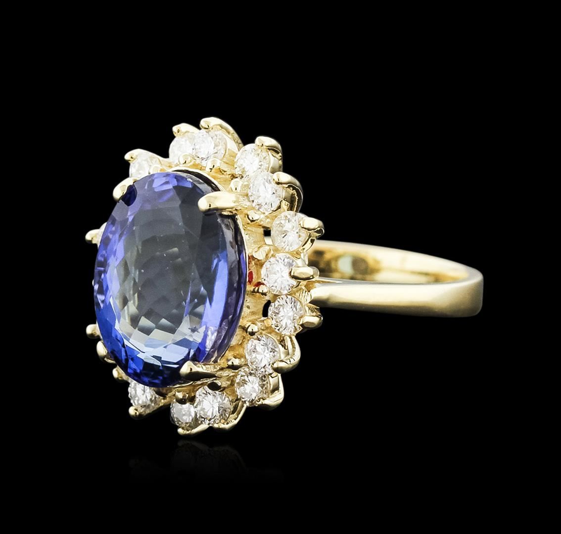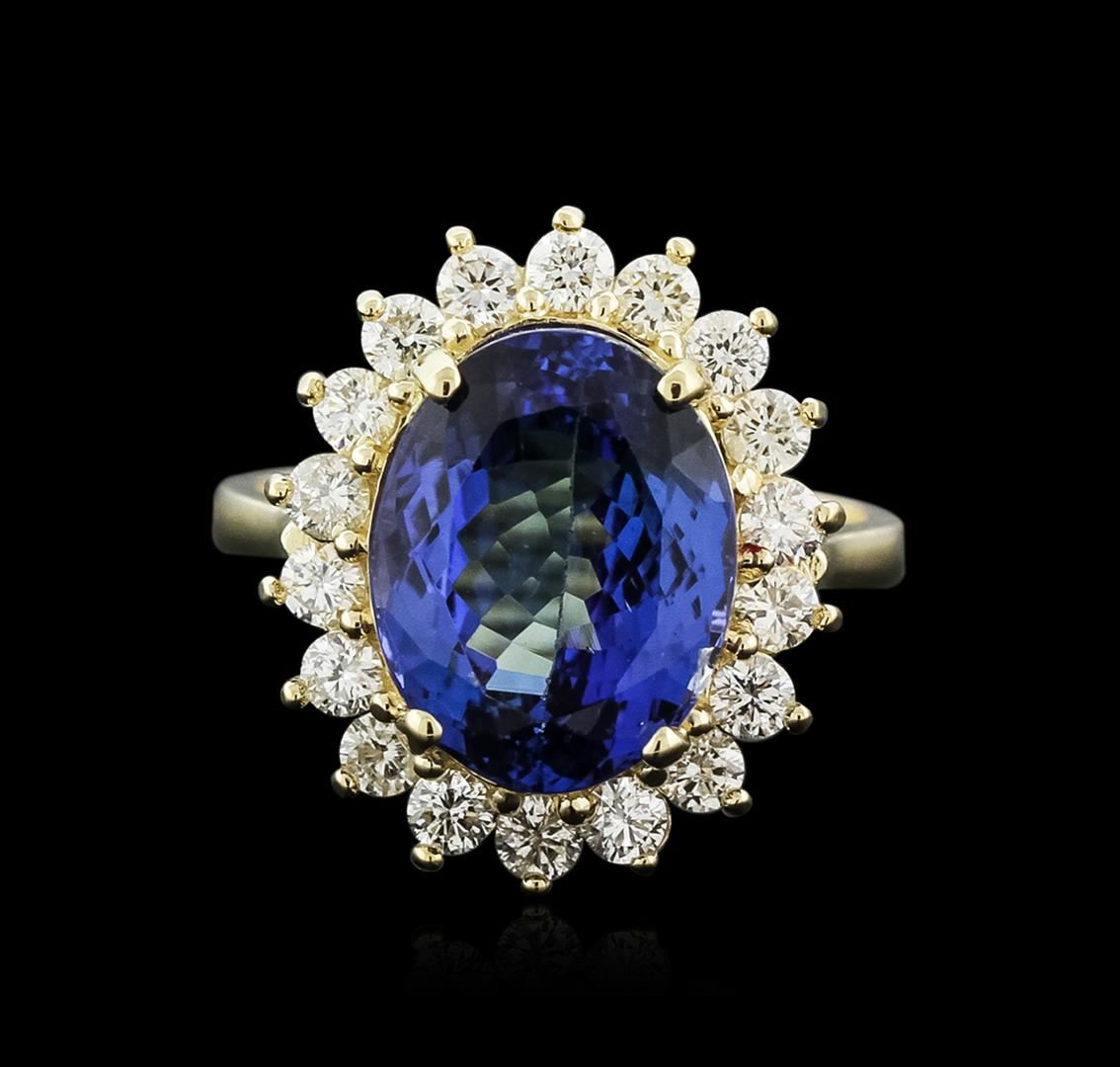 One electronically tested 14KT yellow gold ladies cast tanzanite and diamond ring with a bright polish finish. Identified with markings of "14K". Condition is new. Containing: One prong set oval modified brilliant cut natural tanzanite, measuring 12.44 x 9.78 x 6.36mm, approximate weight of 5.44ct., clarity is eye clean, type I, medium, moderately strong, bluish violet color, (GIA bV 5/4), cut is good. Eighteen prong set round brilliant cut diamonds, measuring 2.20 - 2.20 x 1.32mm (depth est.) approximate total weight of 18 Stones = 0.70ct. Clarity: SI-1 to SI-2. Color: J - K, Cut is Good. Colored gemstones are presumed to have been subjected to commonly used enhancement processes. All diamonds and colored gemstones are graded in the mounting, unless otherwise stated. Total Weight of Colored Stones 5.44ct. Total Weight of Diamonds 0.70ct. Total Weight of Ring 6.00 grams. GGL Appraised at $6,045.00.