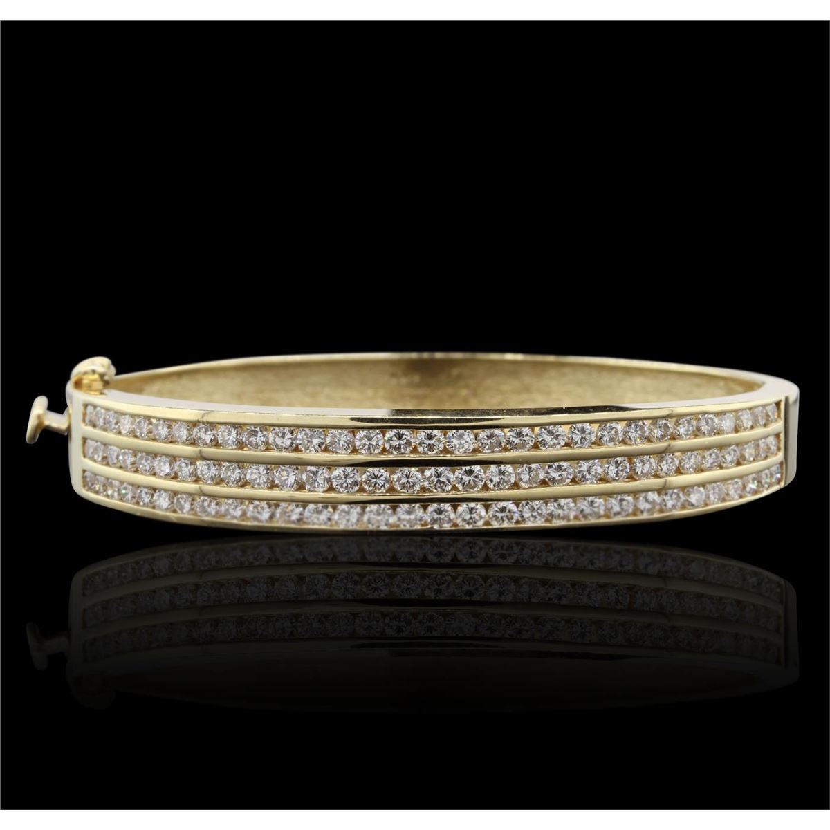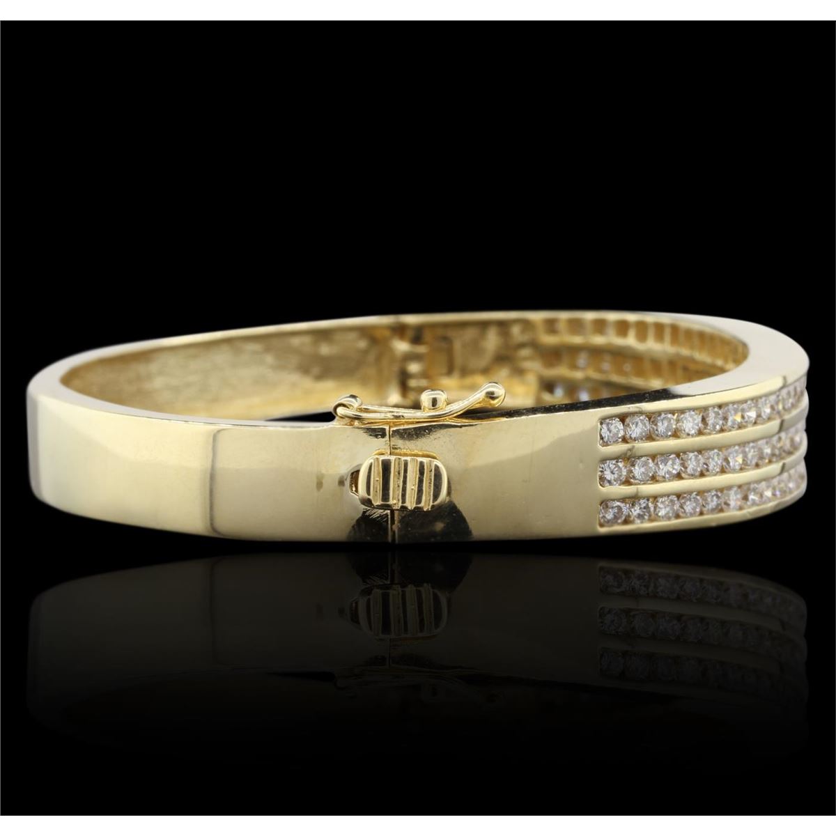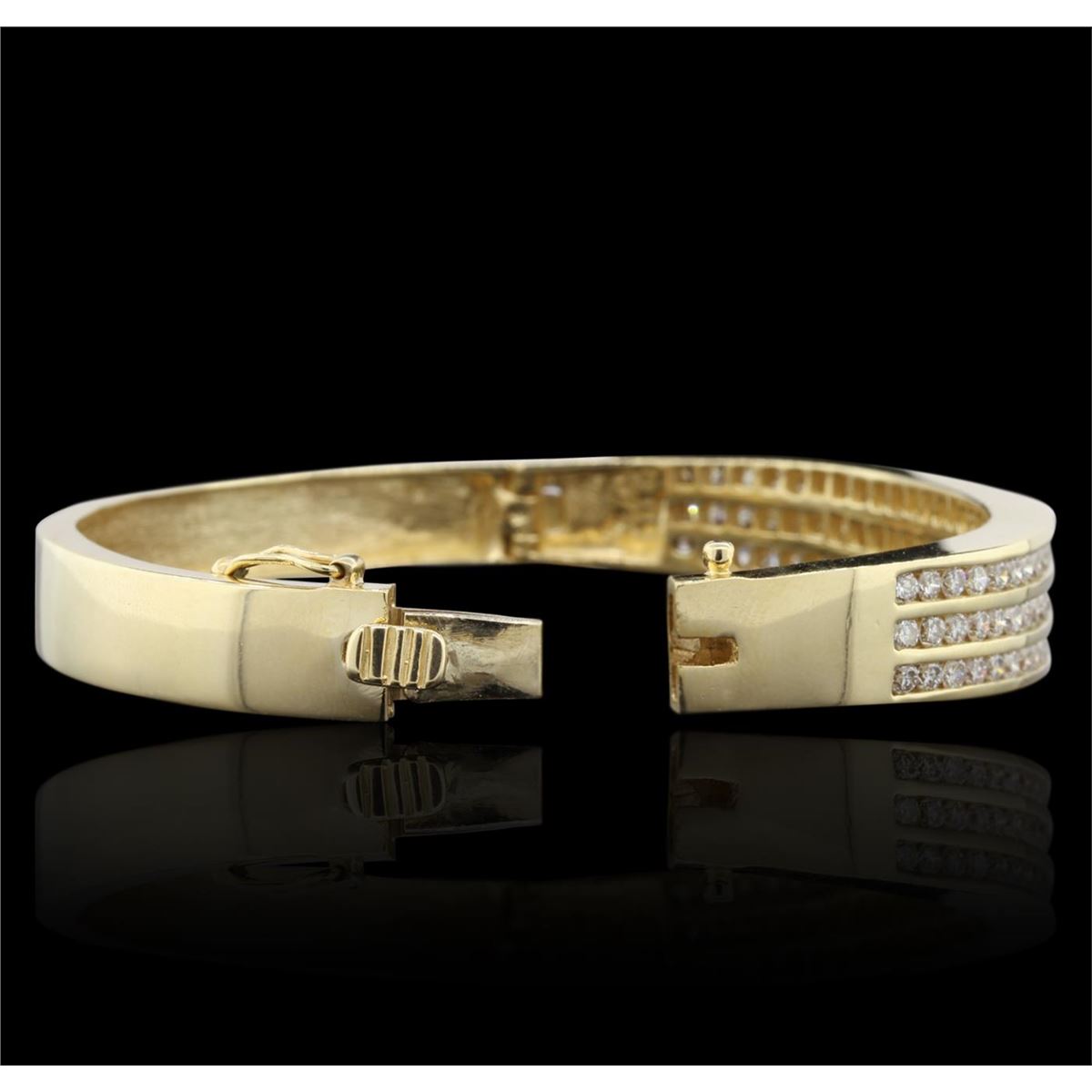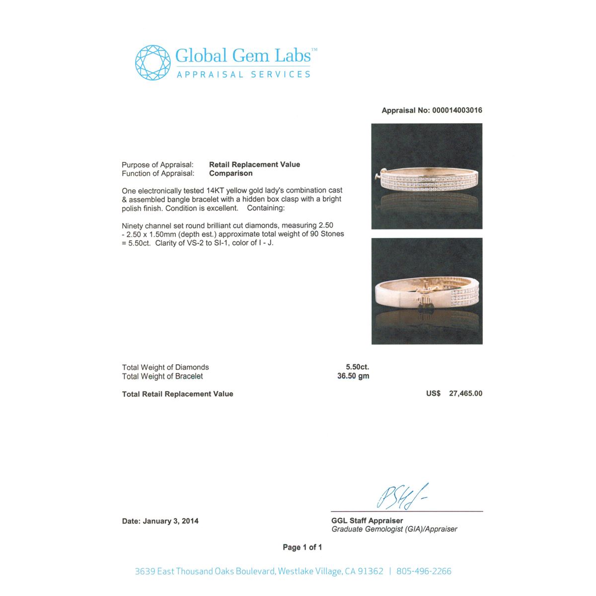 One electronically tested 14KT yellow gold Ladies combination cast & assembled bangle bracelet with a hidden box clasp with a bright polish finish. Condition is excellent. Containing: Ninety channel set round brilliant cut diamonds, measuring 2.50 - 2.50 x 1.50mm (depth est.) approximate total weight of 90 Stones = 5.50ct. Clarity of VS-2 to SI-1, Color of I - J. Total Weight of Diamonds 5.50ct. Total Weight of Bracelet 36.50gm. GGL Appraised at $27,465.00.