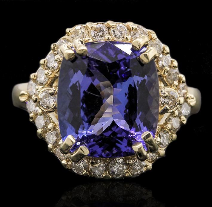 One electronically tested 14KT yellow gold Ladies combination cast & assembled ring with a bright polish finish. Condition is new. Identified with markings of "K14". Containing: One prong set rectangular cushion modified brilliant cut natural tanzanite, measuring 11.50 x 10.30 x 6.20mm, approximate weight of 5.78ct., clarity is eye clean, type I, medium light, moderately strong, bluish violet color, (GIA bV 4/4), cut is very good. Colored gemstones are presumed to have been subjected to commonly used color/clarity enhancement processes. Twenty-Six prong set round brilliant cut diamonds, measuring 2.00 - 2.00 x 1.20mm (depth est.) approximate. Total Weight of 26 Stones = 0.76ct. Clarity: I-1 to I-2. Color: K - L, Cut is Good. Total Weight of Colored Stones 5.78ct. Total Weight of Diamonds 0.76ct. Total Weight of Ring 6.30 grams. GGL Appraised at $10,905.00.