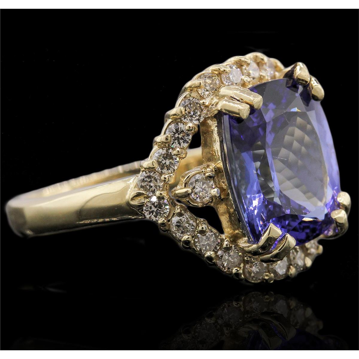 One electronically tested 14KT yellow gold Ladies combination cast & assembled ring with a bright polish finish. Condition is new. Identified with markings of "K14". Containing: One prong set rectangular cushion modified brilliant cut natural tanzanite, measuring 11.50 x 10.30 x 6.20mm, approximate weight of 5.78ct., clarity is eye clean, type I, medium light, moderately strong, bluish violet color, (GIA bV 4/4), cut is very good. Colored gemstones are presumed to have been subjected to commonly used color/clarity enhancement processes. Twenty-Six prong set round brilliant cut diamonds, measuring 2.00 - 2.00 x 1.20mm (depth est.) approximate. Total Weight of 26 Stones = 0.76ct. Clarity: I-1 to I-2. Color: K - L, Cut is Good. Total Weight of Colored Stones 5.78ct. Total Weight of Diamonds 0.76ct. Total Weight of Ring 6.30 grams. GGL Appraised at $10,905.00.