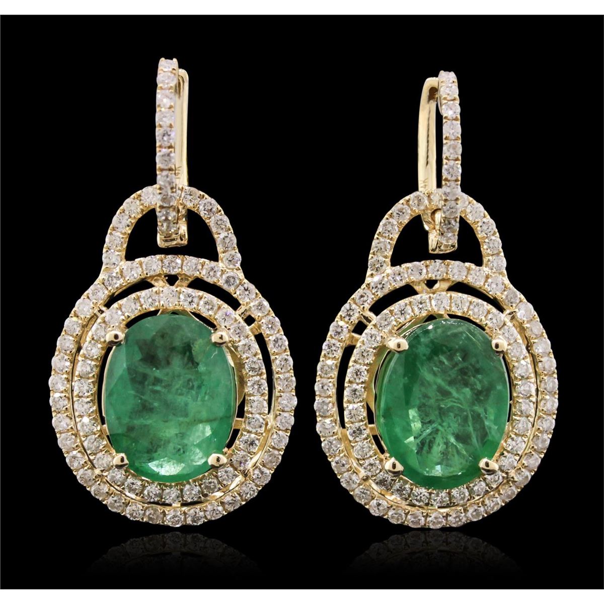 One pair electronically tested 14KT yellow gold Ladies cast earrings with hinged clip backs with a bright polish finish. Condition is new. Containing: Eighty-Nine prong set round brilliant cut diamonds, measuring 1.30 - 1.30 x 0.78mm (depth est.) approximate total weight of 89 Stones = 0.71ct. Clarity: I-1 to I-2. Color: J - K, Cut is Good. Two prong set oval modified brilliant cut natural emeralds, measuring 11.20 x 8.50 x 5.53mm, approximate total weight of 5.84ct., clarity is heavily included, type III, medium, moderately strong, green color, (GIA G 5/4), cut is good. Colored gemstones are presumed to have been subjected to commonly used enhancement processes. All diamonds and colored gemstones are graded in the mounting, unless otherwise stated. Total Weight of Colored Stones 5.84ct. Total Weight of Diamonds 0.71ct. Total Weight of Earrings 7.40 grams. GGL Appraised at $12,670.00.