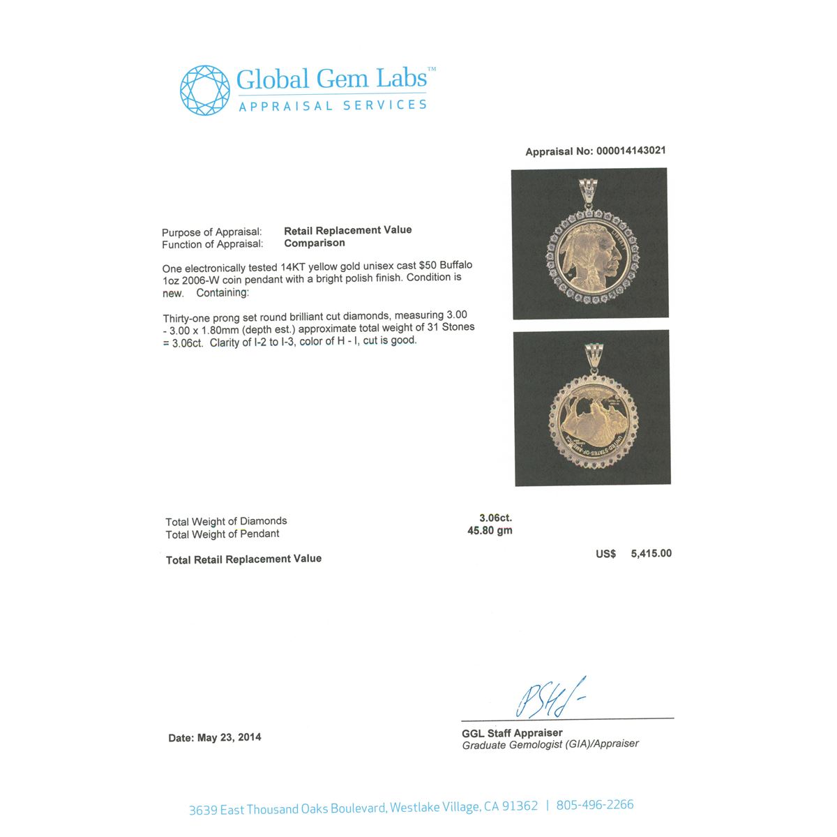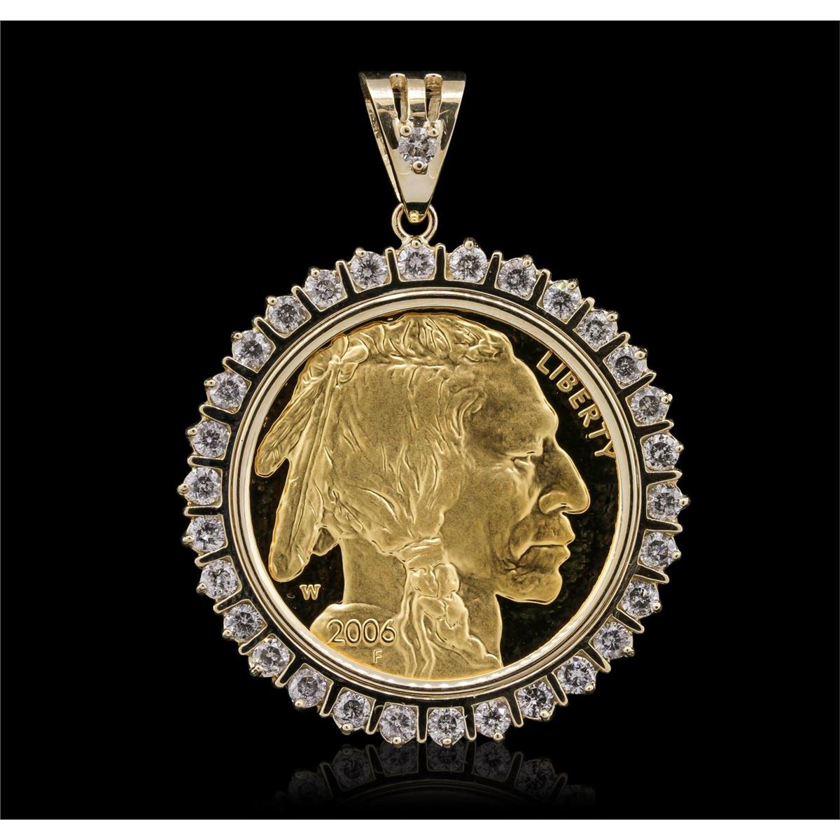 One electronically tested 14KT yellow gold unisex cast $50 Buffalo 1oz 2006-W coin pendant with a bright polish finish. Condition is new. Containing: Thirty-One prong set round brilliant cut diamonds, measuring 3.00 - 3.00 x 1.80mm (depth est.) approximate. Total Weight of 31 Stones = 3.06ct. Clarity: I-2 to I-3. Color: H - I, Cut is Good. Total Weight of Diamonds 3.06ct. Total Weight of Pendant 45.80 grams. GGL Appraised at $5,415.00.