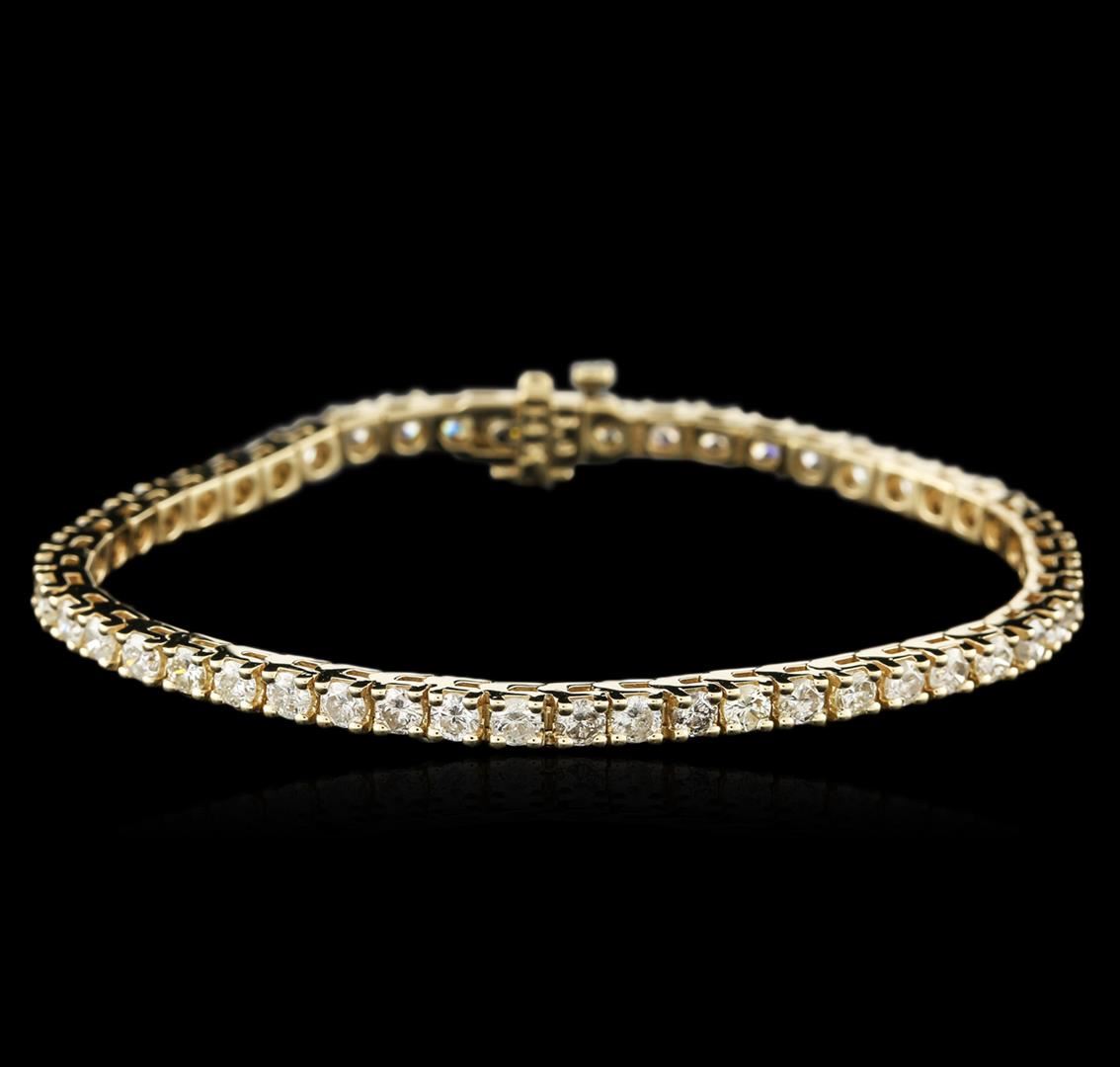 One electronically tested 14KT yellow gold ladies cast diamond tennis bracelet with a hidden box clasp with safety closer with a bright polish finish. Measurements: 7". Identified with markings of "14K". Condition is new. Containing: Fifty prong set round brilliant cut diamonds, measuring 3.20 - 3.20 x 1.92mm (depth est.) approximate total weight of 50 Stones = 6.06ct. Clarity: I-1 to I-2. Color: J - K, Cut is Good. Diamonds are graded in the mounting, unless otherwise stated. Total Weight of Diamonds 6.06ct. Total Weight of Tennis Bracelet 13.90 grams. GGL Appraised at $7,170.00.