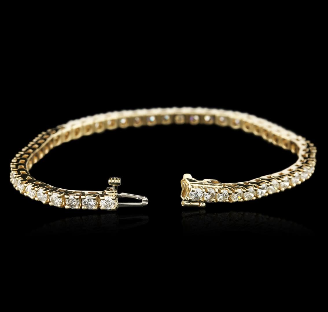 One electronically tested 14KT yellow gold ladies cast diamond tennis bracelet with a hidden box clasp with safety closer with a bright polish finish. Measurements: 7". Identified with markings of "14K". Condition is new. Containing: Fifty prong set round brilliant cut diamonds, measuring 3.20 - 3.20 x 1.92mm (depth est.) approximate total weight of 50 Stones = 6.06ct. Clarity: I-1 to I-2. Color: J - K, Cut is Good. Diamonds are graded in the mounting, unless otherwise stated. Total Weight of Diamonds 6.06ct. Total Weight of Tennis Bracelet 13.90 grams. GGL Appraised at $7,170.00.