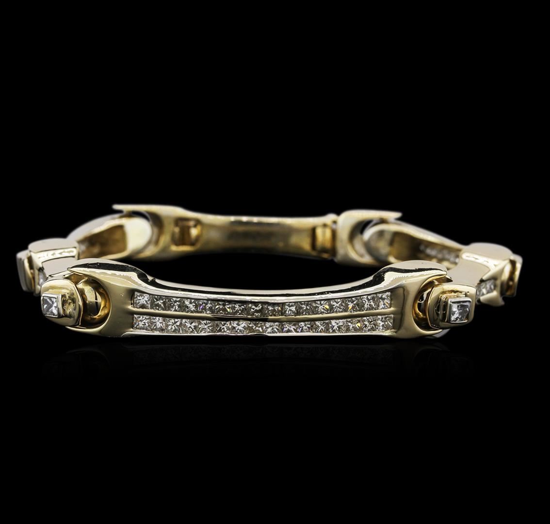 One electronically tested 14KT yellow gold ladies cast diamond bracelet with a foldover clasp with a bright polish finish. Identified with markings of "14K". Condition is new. Containing: Two bezel set princess cut diamonds, measuring 3.00 x 3.00 x 2.25mm (depth est.) approximate total weight of 2 Stones = 0.33ct. Clarity: SI-1. Color: H, Cut is Good. Sixty-Three channel set princess cut diamonds, measuring 2.80 x 2.30 x 1.73mm (depth est.) approximate total weight of 63 Stones = 5.75ct. Clarity: VS-2 to SI-1. Color: H - I, Cut is Good. Diamonds are graded in the mounting, unless otherwise stated. Total Weight of Diamonds 6.08ct. Total Weight of Bracelet 85.00 grams. GGL Appraised at $19,975.00.
