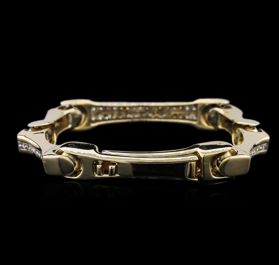 One electronically tested 14KT yellow gold ladies cast diamond bracelet with a foldover clasp with a bright polish finish. Identified with markings of "14K". Condition is new. Containing: Two bezel set princess cut diamonds, measuring 3.00 x 3.00 x 2.25mm (depth est.) approximate total weight of 2 Stones = 0.33ct. Clarity: SI-1. Color: H, Cut is Good. Sixty-Three channel set princess cut diamonds, measuring 2.80 x 2.30 x 1.73mm (depth est.) approximate total weight of 63 Stones = 5.75ct. Clarity: VS-2 to SI-1. Color: H - I, Cut is Good. Diamonds are graded in the mounting, unless otherwise stated. Total Weight of Diamonds 6.08ct. Total Weight of Bracelet 85.00 grams. GGL Appraised at $19,975.00.