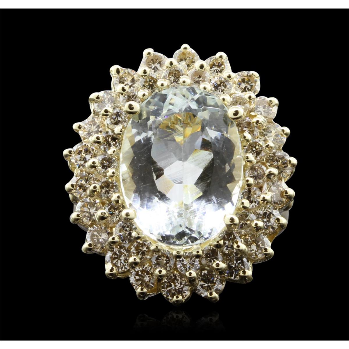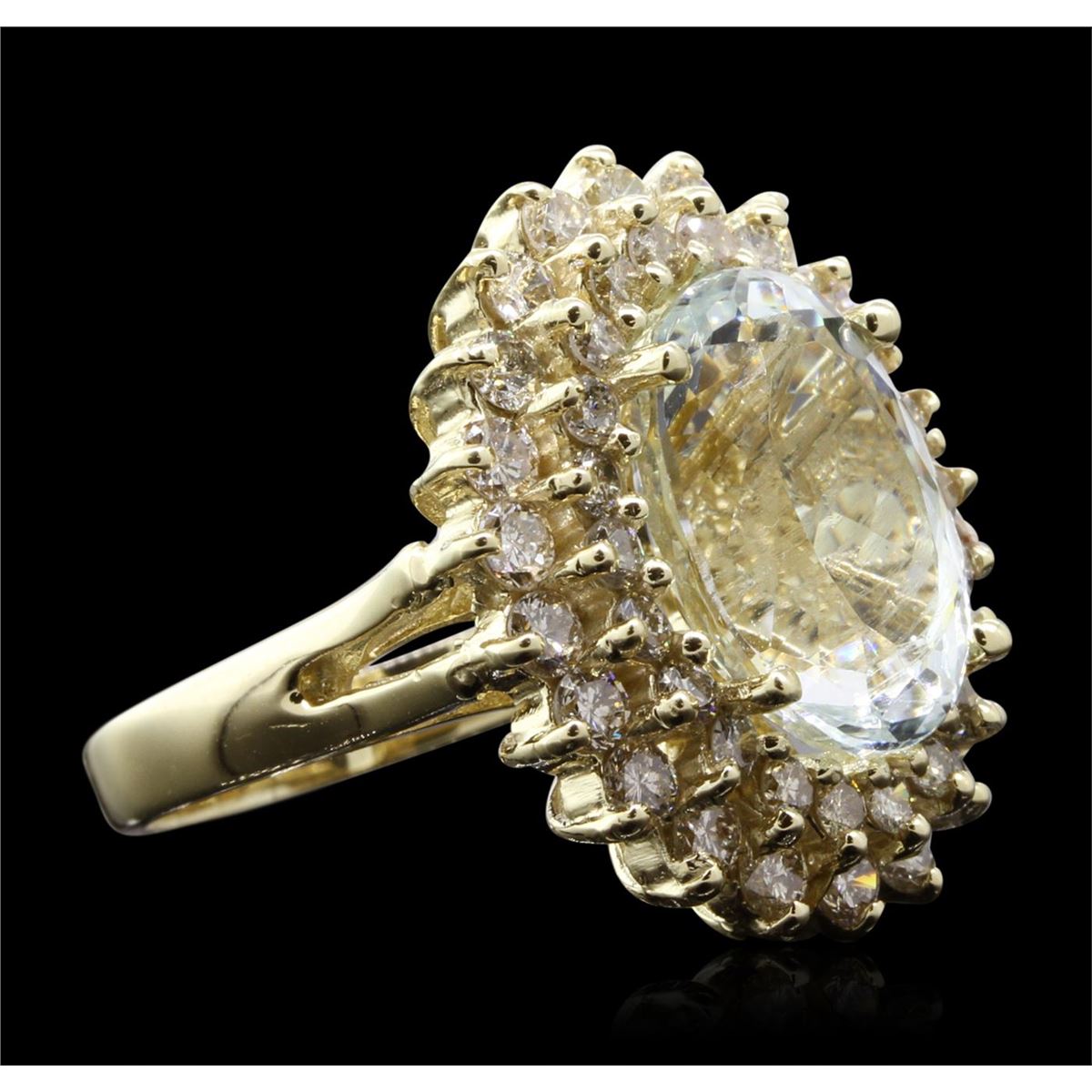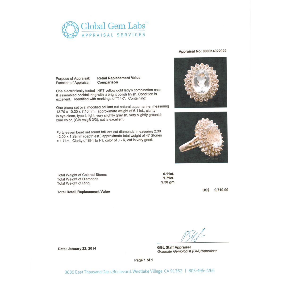 One electronically tested 14KT yellow gold Ladies combination cast & assembled cocktail ring with a bright polish finish. Identified with markings of "14K". Condition is excellent. Containing: One prong set oval modified brilliant cut natural aquamarine, measuring 13.70 x 10.30 x 7.10mm, approximate weight of 6.11ct., clarity is eye clean, type I, light, very slightly grayish, very slightly greenish blue color, (GIA vslgB 3/3), cut is excellent. Forty-Seven bead set round brilliant cut diamonds, measuring 2.30 - 2.00 x 1.29mm (depth est.) approximate total weight of 47 Stones = 1.71ct. Clarity of SI-1 to I-1, Color of J - K, Cut is Very Good. Total Weight of Colored Stones 6.11ct. Total Weight of Diamonds 1.71ct. Total Weight of Ring 9.30gm. GGL Appraised at $9,710.00.