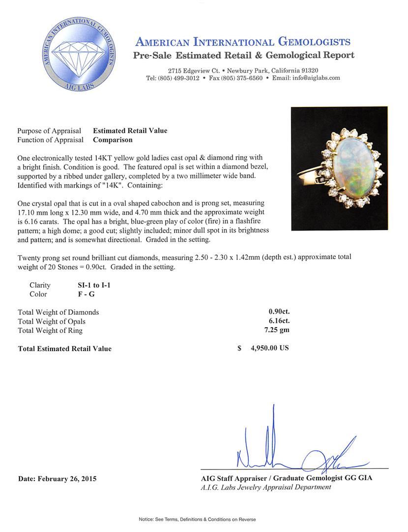 One electronically tested 14KT yellow gold ladies cast opal & diamond ring with a bright finish. The featured opal is set within a diamond bezel, supported by a ribbed under gallery, completed by a two millimeter wide band. Identified with markings of "14K". Condition is good. Containing: One crystal opal that is cut in a oval shaped cabochon and is prong set, measuring 17.10 mm long x 12.30 mm wide, and 4.70 mm thick and the approximate weight is 6.16 carats. The opal has a bright, blue-green play of color (fire) in a flashfire pattern; a high dome; a good cut; slightly included; minor dull spot in its brightness and pattern; and is somewhat directional. Graded in the setting. Twenty prong set round brilliant cut diamonds, measuring 2.50 - 2.30 x 1.42mm (depth est.) approximate total weight of 20 Stones = 0.90ct. Graded in the setting. Clarity: SI-1 to I-1. Color: F - G. Total Weight of Diamonds 0.90ct. Total Weight of Opals 6.16ct. Total Weight of Ring 7.25 grams. AIG Appraised at $4,950.00.