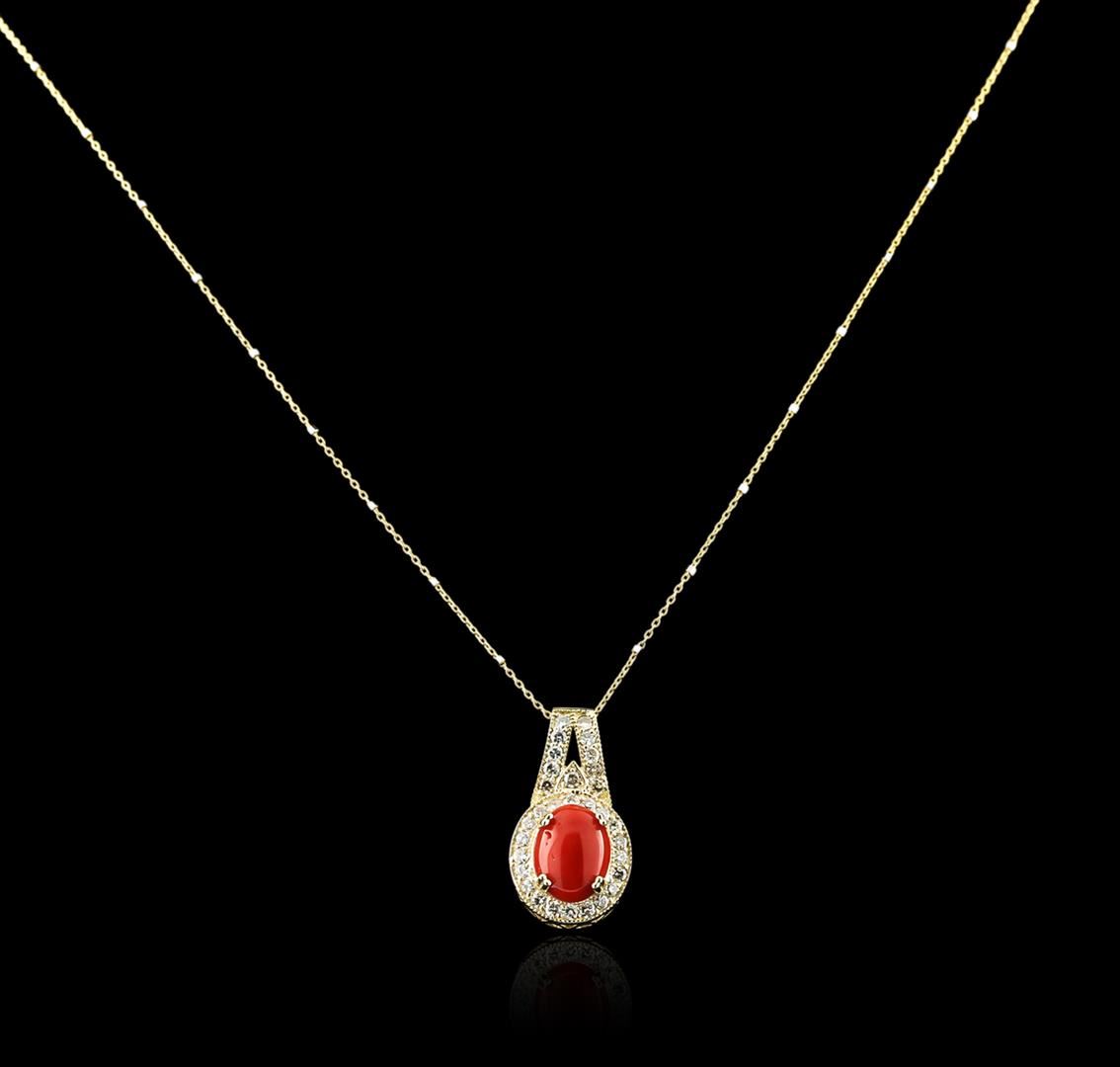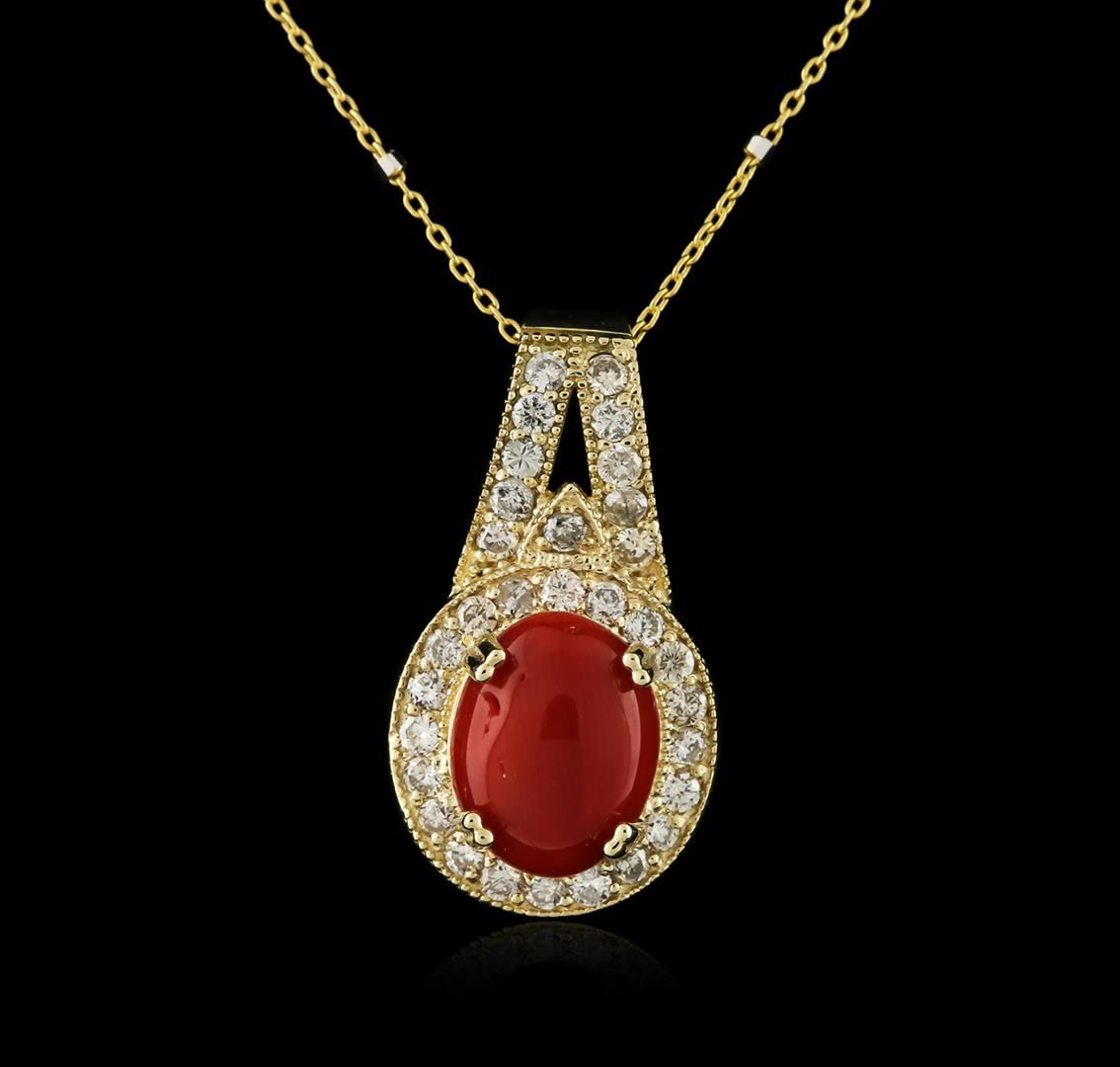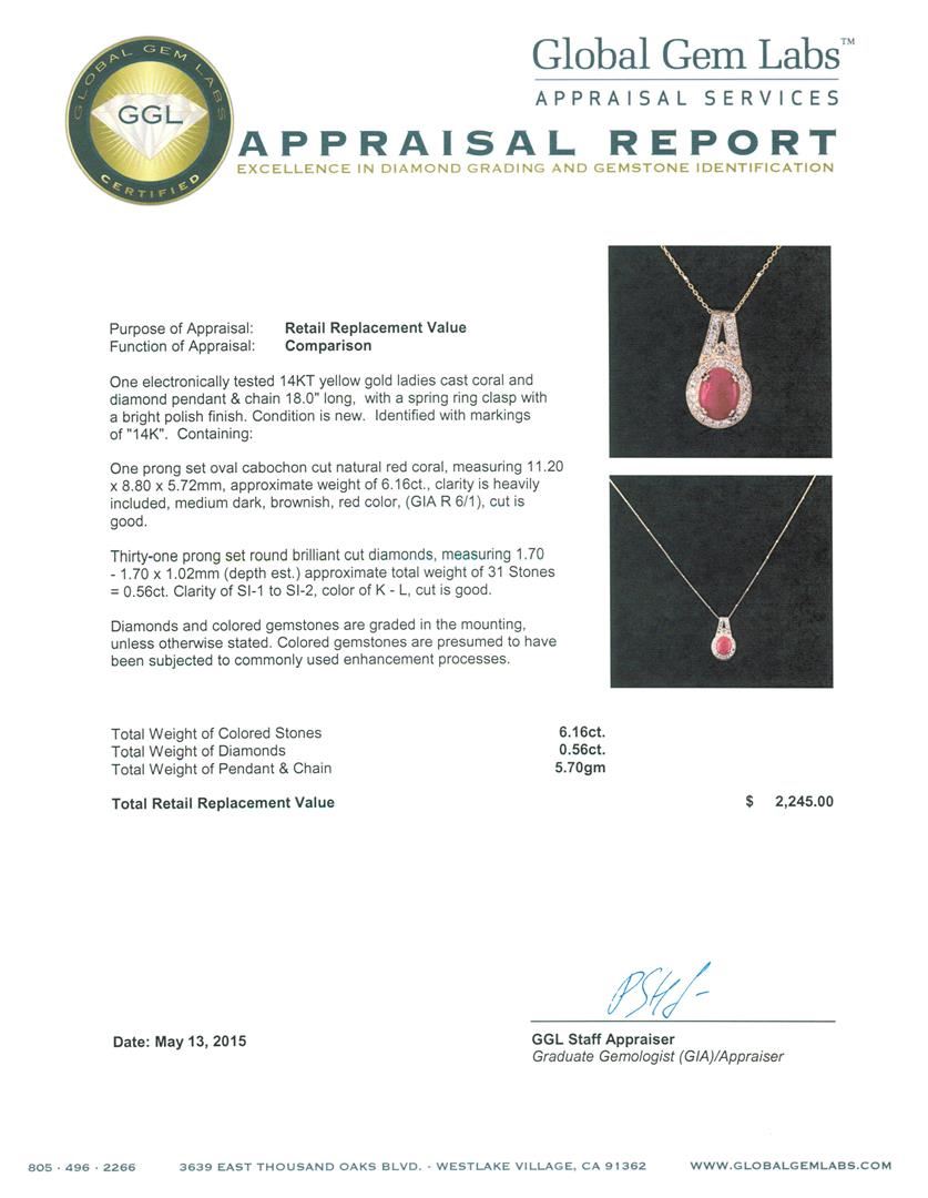 One electronically tested 14KT yellow gold ladies cast coral and diamond pendant & chain 18.0" long, with a spring ring clasp with a bright polish finish. Identified with markings of "14K". Condition is new. Containing: One prong set oval cabochon cut natural red coral, measuring 11.20 x 8.80 x 5.72mm, approximate weight of 6.16ct., clarity is heavily included, medium dark, brownish, red color, (GIA R 6/1), cut is good. Thirty-One prong set round brilliant cut diamonds, measuring 1.70 - 1.70 x 1.02mm (depth est.) approximate total weight of 31 Stones = 0.56ct. Clarity: SI-1 to SI-2. Color: K - L, Cut is Good. Diamonds and colored gemstones are graded in the mounting, unless otherwise stated. Colored gemstones are presumed to have been subjected to commonly used enhancement processes. Total Weight of Colored Stones 6.16ct. Total Weight of Diamonds 0.56ct. Total Weight of Pendant & Chain 5.70 grams. GGL Appraised at $2,245.00.
