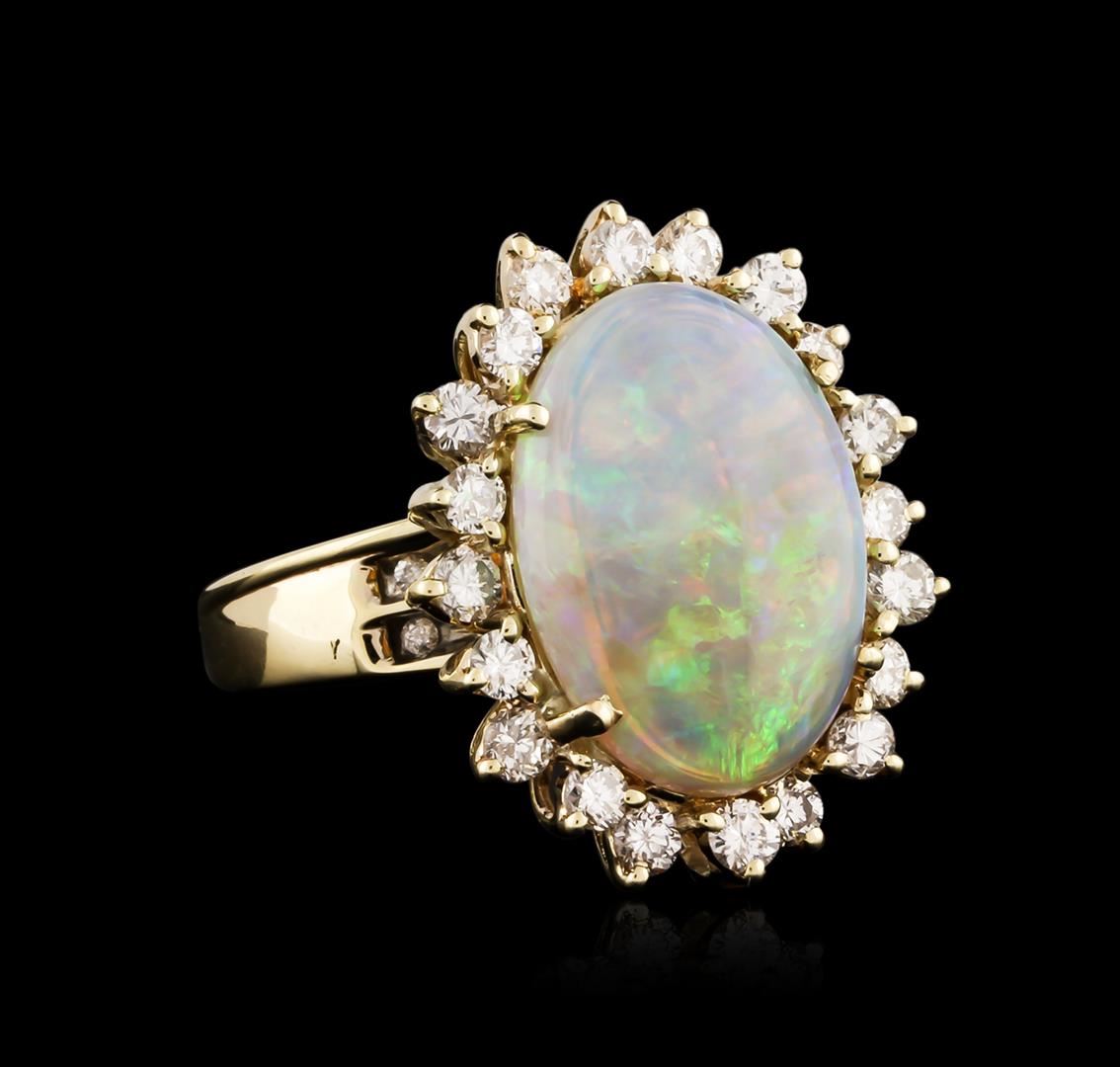 One electronically tested 14KT yellow gold ladies cast opal & diamond ring with a bright finish. The featured opal is set within a diamond bezel, supported by a ribbed under gallery, completed by a two millimeter wide band. Identified with markings of "14K". Condition is good. Containing: One crystal opal that is cut in a oval shaped cabochon and is prong set, measuring 17.10 mm long x 12.30 mm wide, and 4.70 mm thick and the approximate weight is 6.16 carats. The opal has a bright, blue-green play of color (fire) in a flashfire pattern; a high dome; a good cut; slightly included; minor dull spot in its brightness and pattern; and is somewhat directional. Graded in the setting. Twenty prong set round brilliant cut diamonds, measuring 2.50 - 2.30 x 1.42mm (depth est.) approximate total weight of 20 Stones = 0.90ct. Graded in the setting. Clarity: SI-1 to I-1. Color: F - G. Total Weight of Diamonds 0.90ct. Total Weight of Opals 6.16ct. Total Weight of Ring 7.25 grams. AIG Appraised at $4,950.00.