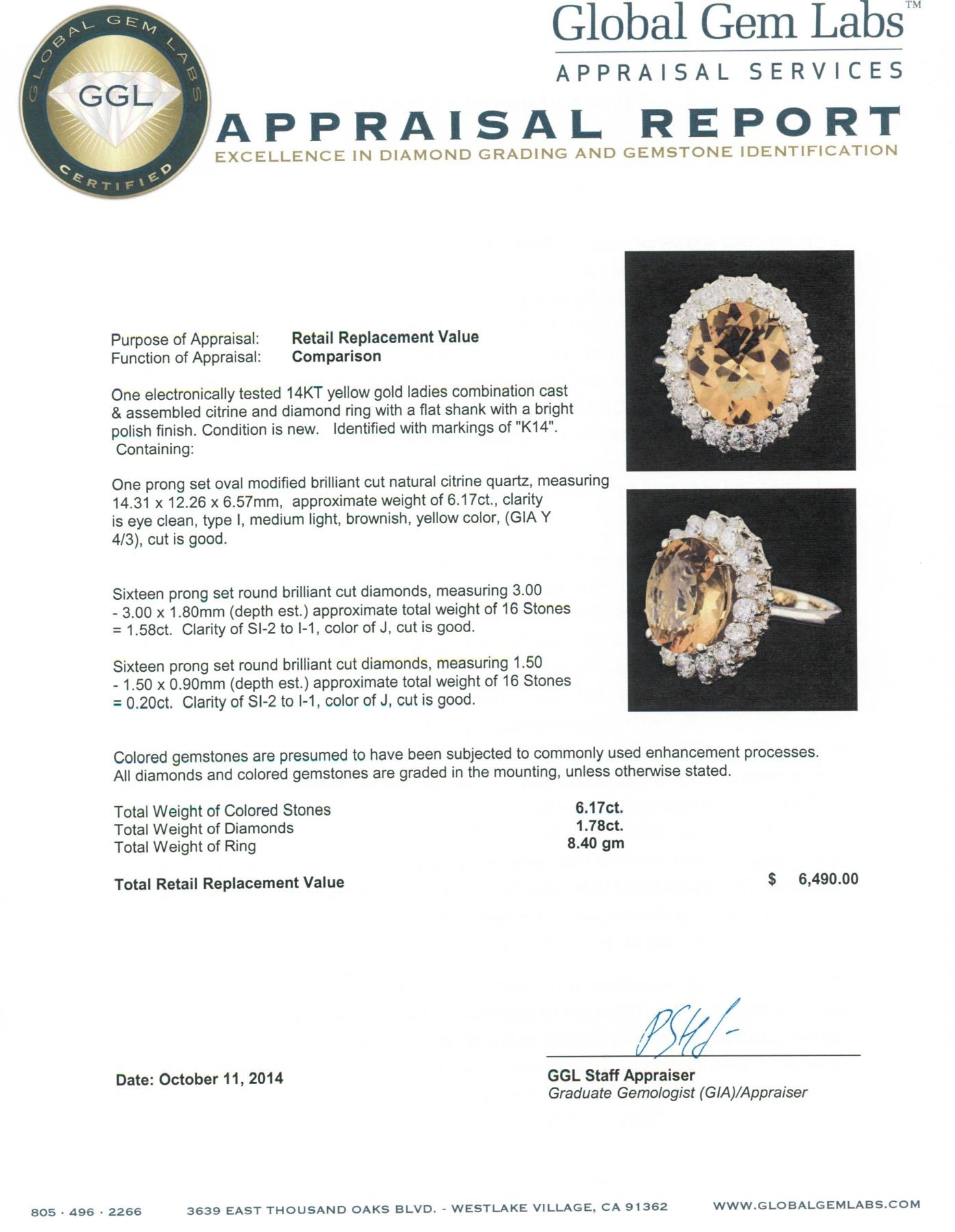 One electronically tested 14KT yellow gold ladies combination cast & assembled citrine and diamond ring with a flat shank with a bright polish finish. Identified with markings of "K14". Condition is new. Containing: One prong set oval modified brilliant cut natural citrine quartz, measuring 14.31 x 12.26 x 6.57mm, approximate weight of 6.17ct., clarity is eye clean, type I, medium light, brownish, yellow color, (GIA Y 4/3), cut is good. Sixteen prong set round brilliant cut diamonds, measuring 3.00 - 3.00 x 1.80mm (depth est.) approximate total weight of 16 Stones = 1.58ct. Clarity: SI-2 to I-1. Color: J, Cut is Good. Sixteen prong set round brilliant cut diamonds, measuring 1.50 - 1.50 x 0.90mm (depth est.) approximate total weight of 16 Stones = 0.20 ct. Clarity: SI-2 to I-1. Color: J, Cut is Good. Colored gemstones are presumed to have been subjected to commonly used enhancement processes. All diamonds and colored gemstones are graded in the mounting, unless otherwise stated. Total Weight of Colored Stones 6.17ct. Total Weight of Diamonds 1.78ct. Total Weight of Ring 8.40 grams. GGL Appraised.