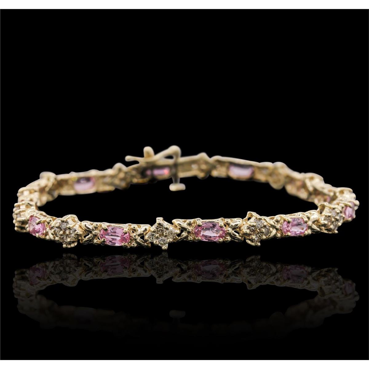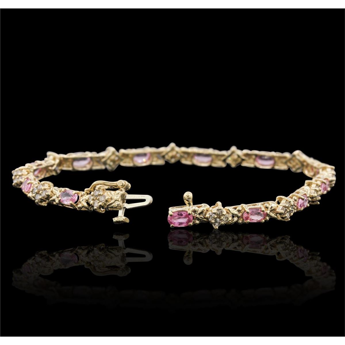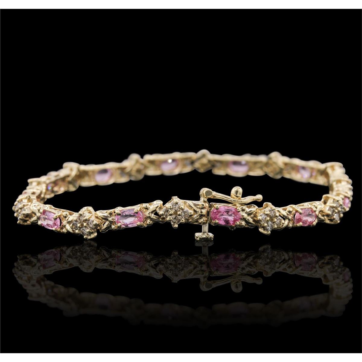 One bracelet featuring: 14KT Yellow Gold with a total weight of 10.2 grams, pink sapphires with a total weight of 6.24ctw and Diamonds with a total weight of 1.35ctw.