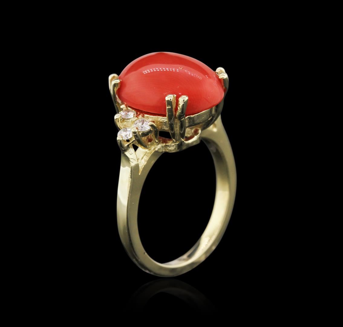 One electronically tested 14KT yellow gold ladies cast coral and diamond ring with a bright polish finish. Identified with markings of "14K". Condition is new. Containing: One prong set oval cabochon cut natural red coral, measuring 15.00 x 11.00 x 7.15mm, approximate weight of 6.25ct., clarity is severely included, medium dark, brownish, red color, (GIA R 6/1), cut is good. Six prong set round brilliant cut diamonds, measuring 2.30 - 2.30 x 1.38mm (depth est.) approximate total weight of 6 Stones = 0.25ct. Clarity: SI-1 to SI-2. Color: I - J, Cut is Good. Colored gemstones are presumed to have been subjected to commonly used enhancement processes. All diamonds and colored gemstones are graded in the mounting, unless otherwise stated. Total Weight of Colored Stones 6.25ct. Total Weight of Diamonds 0.25ct. Total Weight of Ring 6.36 grams. GGL Appraised at $1,960.00.