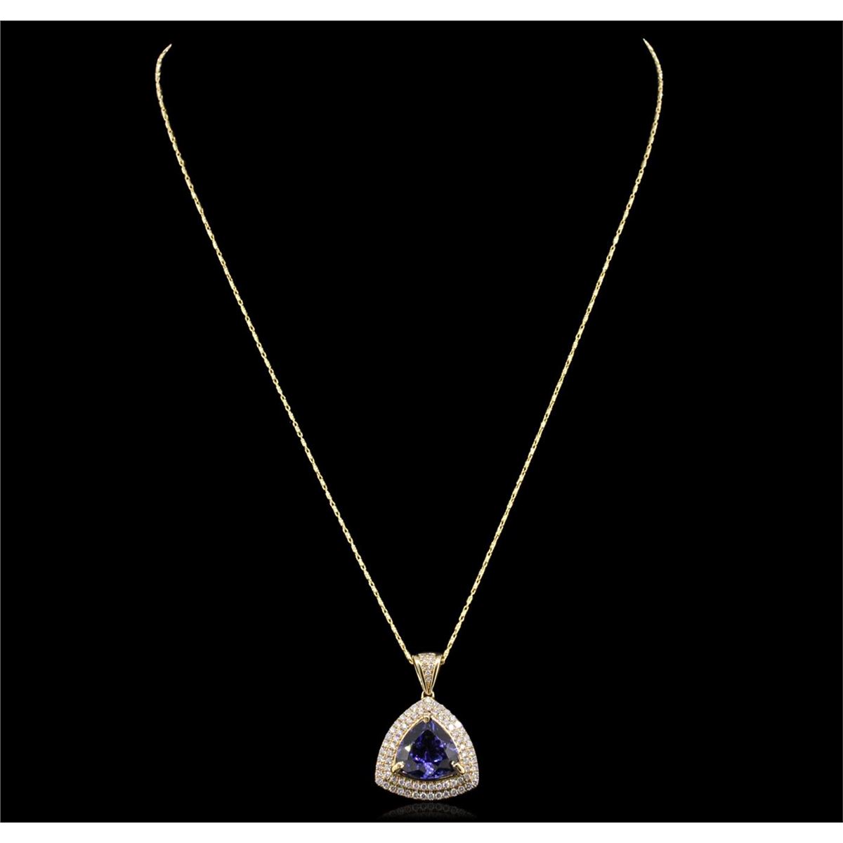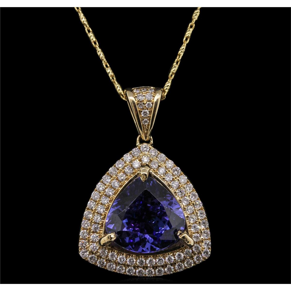 One electronically tested 14KT yellow gold ladies cast & assembled tanzanite and diamond pendant with chain. The pendant features a tanzanite set within two tiered diamond bezels, completed by a diamond set bail. The pendant is supported by an eighteen inch length 14KT yellow gold designer style chain, terminating in a lobster claw clasp. Bright polish finish. Identified with markings of "14K". Condition is new, good workmanship. Containing: One prong set pear brilliant cut natural tanzanite, measuring 11.60 x 11.90 x 6.60mm, 6% bulge factor, approximate weight of 6.47ct., clarity is eye clean, type I, medium dark, slightly grayish, violetish blue color, (GIA vB 6/2), cut is good. Transmitting light with no distortion, transparent. Colored Stone Grading Report attached. Graded in the setting. Tanzanite is a very rare gemstone that is only found in the country of Tanzania. Originally discovered in 1967. Tiffany & Company, named the stone Tanzanite. It is found in the Usumburu Mountains that border the Umba Valley of northern Tanzania. Tanzanite occurs in gray, brown, violet, blue, reddish-purple, & green. The gem is interesting because of its exceptional pleochroism. Rotated in different directions a tanzanite will exhibit multiple changes of color. Tanzanite has a low tolerance to ultrasonic cleaning, and should not be cleaned using this method. Eighty-One prong set round brilliant cut diamonds, measuring 1.50 - 1.30 x 0.84mm (depth est.) approximate total weight of 81 Stones = 0.91ct. Graded in the setting. Clarity: SI-1 to I-1. Color: G - I. Total Weight of Colored Stones 6.47ct. Total Weight of Diamonds 0.91ct. Total Weight of Pendant With Chain 8.94 grams. AIG Appraised at $17,795.00.