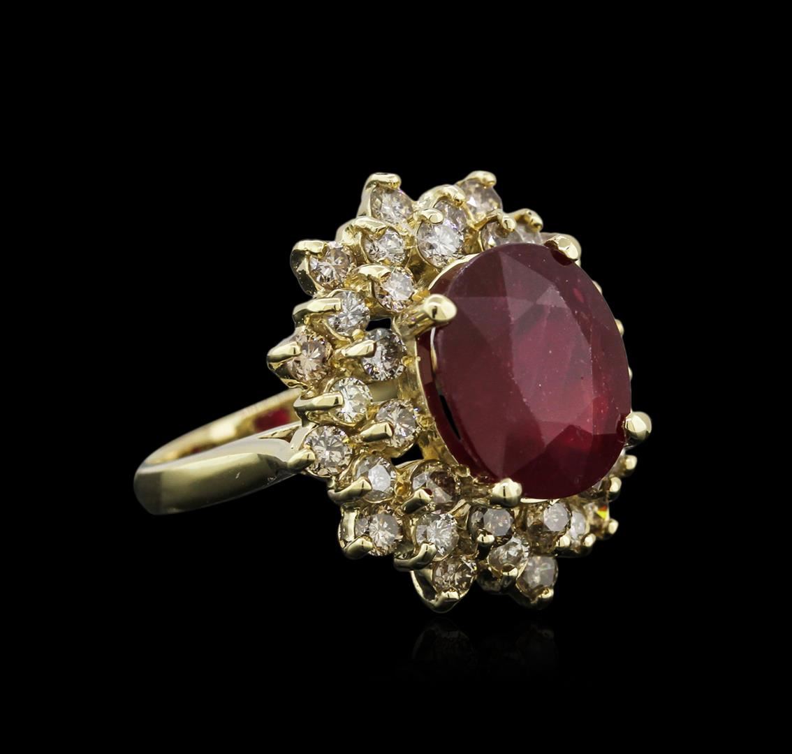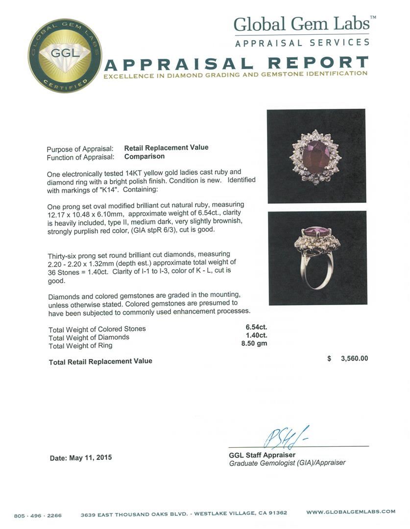 One electronically tested 14KT yellow gold ladies cast ruby and diamond ring with a bright polish finish. Identified with markings of "K14". Condition is new. Containing: One prong set oval modified brilliant cut natural ruby, measuring 12.17 x 10.48 x 6.10mm, approximate weight of 6.54ct., clarity is heavily included, type II, medium dark, very slightly brownish, strongly purplish red color, (GIA stpR 6/3), cut is good. Thirty-Six prong set round brilliant cut diamonds, measuring 2.20 - 2.20 x 1.32mm (depth est.) approximate total weight of 36 Stones = 1.40ct. Clarity: I-1 to I-3. Color: K - L, Cut is Good. Diamonds and colored gemstones are graded in the mounting, unless otherwise stated. Colored gemstones are presumed to have been subjected to commonly used enhancement processes. Total Weight of Colored Stones 6.54ct. Total Weight of Diamonds 1.40ct. Total Weight of Ring 8.50 grams. GGL Appraised at $3,560.00.