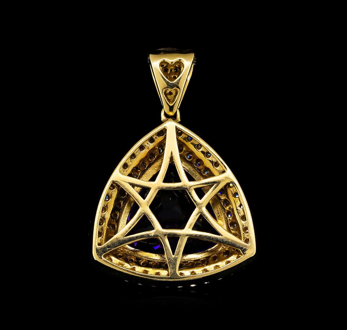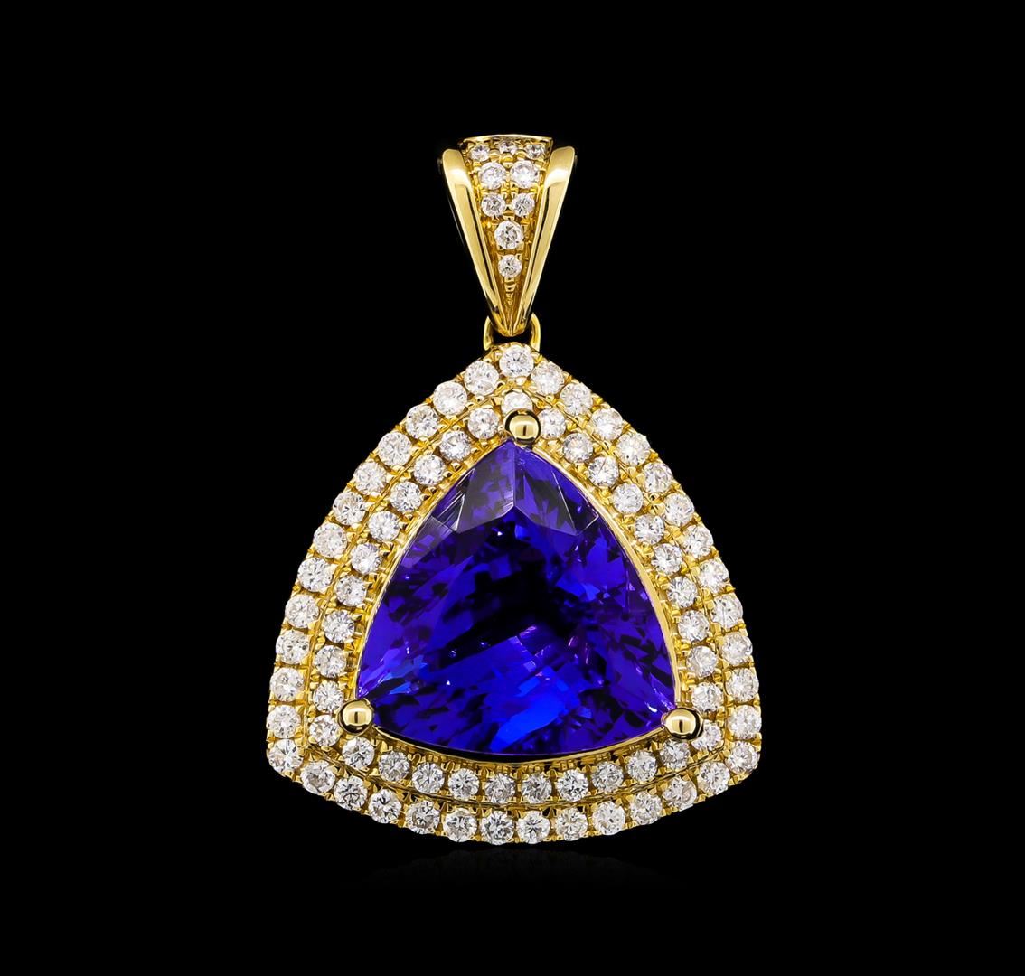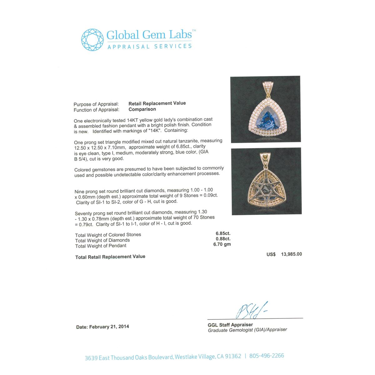 One electronically tested 14KT yellow gold Ladies combination cast & assembled fashion pendant with a bright polish finish. Condition is new. Identified with markings of "14K". Containing: One prong set triangle modified mixed cut natural tanzanite, measuring 12.50 x 12.50 x 7.10mm, approximate weight of 6.85ct., clarity is eye clean, type I, medium, moderately strong, blue color, (GIA B 5/4), cut is very good. Colored gemstones are presumed to have been subjected to commonly used and possible undetectable color/clarity enhancement processes. Nine prong set round brilliant cut diamonds, measuring 1.00 - 1.00 x 0.60mm (depth est.) approximate. Total Weight of 9 Stones = 0.09ct. Clarity: SI-1 to SI-2. Color: G - H, Cut is Good. Seventy prong set round brilliant cut diamonds, measuring 1.30 - 1.30 x 0.78mm (depth est.) approximate. Total Weight of 70 Stones = 0.79ct. Clarity: SI-1 to I-1. Color: H - I, Cut is Good. Total Weight of Colored Stones 6.85ct. Total Weight of Diamonds 0.88ct. Total Weight of Pendant 6.70 grams. GGL Appraised at $13,985.00.